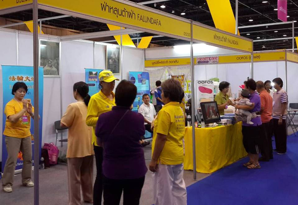 ![]() 图1:二零一五年泰国健康博览会上,人们纷纷来法轮功展位了解功法 |
