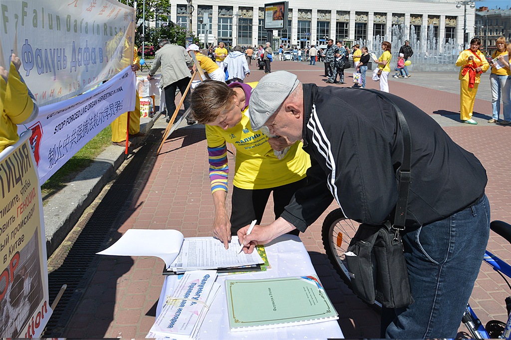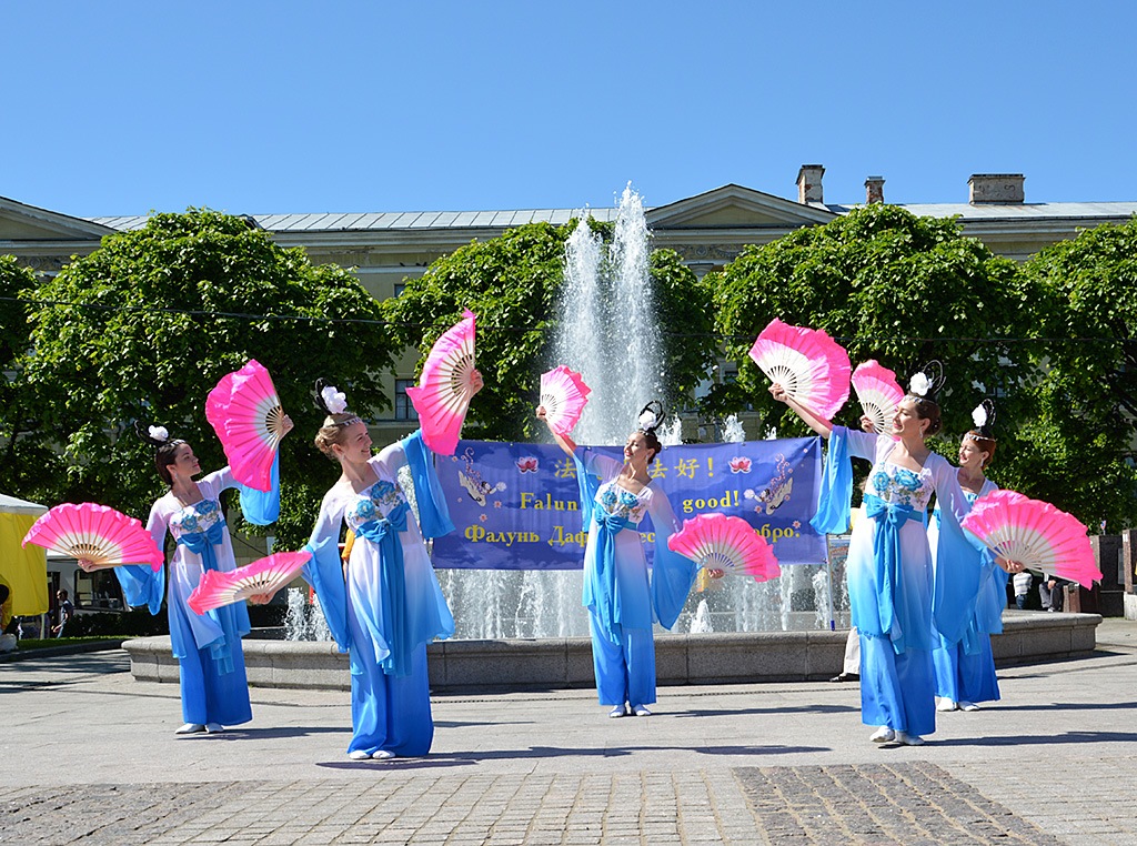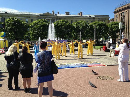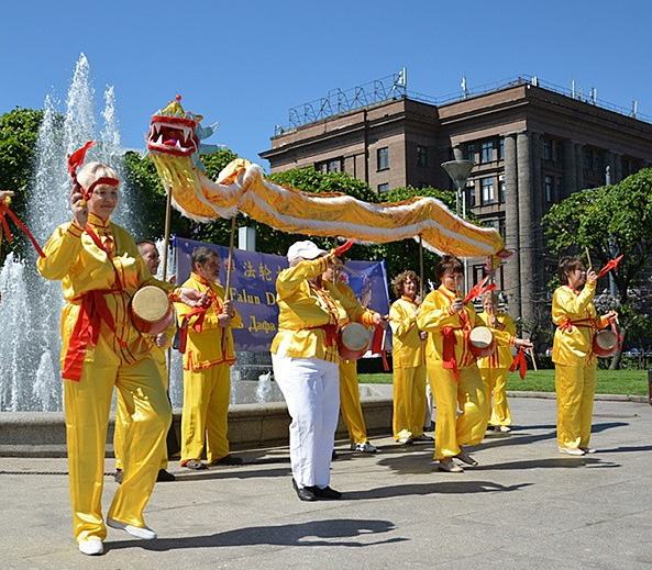 法轮功学员伴随着优美祥和的炼功音乐,给当地市民演示功法。他们还表演了舞蹈、腰鼓、舞龙、舞狮等。人们纷纷驻足观看,并详细了解法轮功的内涵和特点。得知中共十六年来残酷迫害法轮功,甚至活摘法轮功学员的器官后,人们踊跃签名声援法轮功,谴责中共的罪恶。