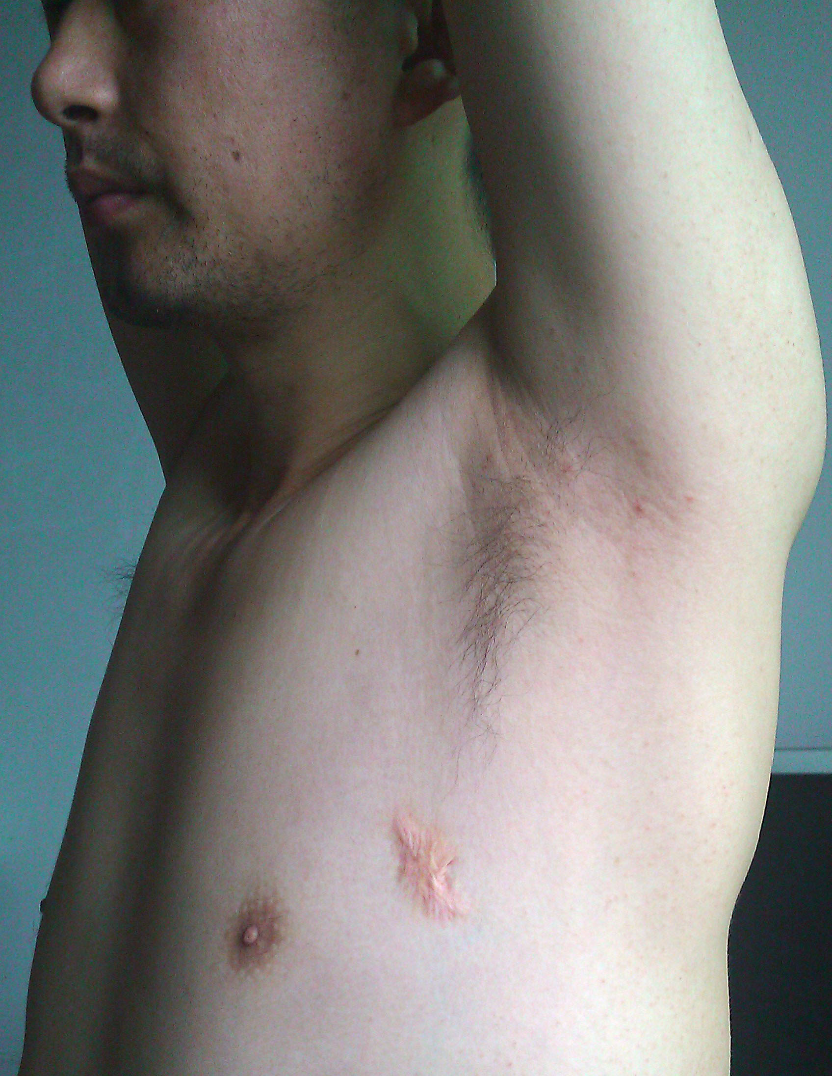 ![]() 张志强2001年5月在劳教所被吊打烫伤腋窝伤疤,2015年6月手机拍照 |