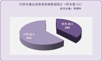 统计显示:被迫害致死的法轮功学员中:女性:32人 占样本量的62%; 男性:20人 占样本量的38%。