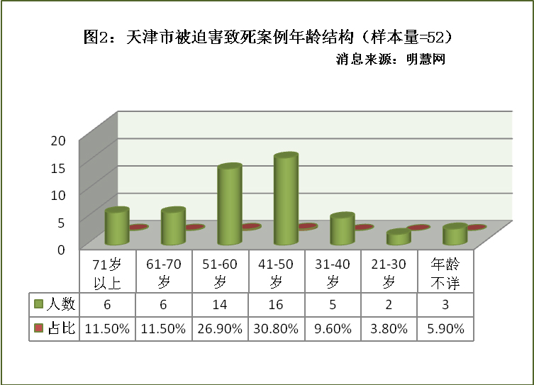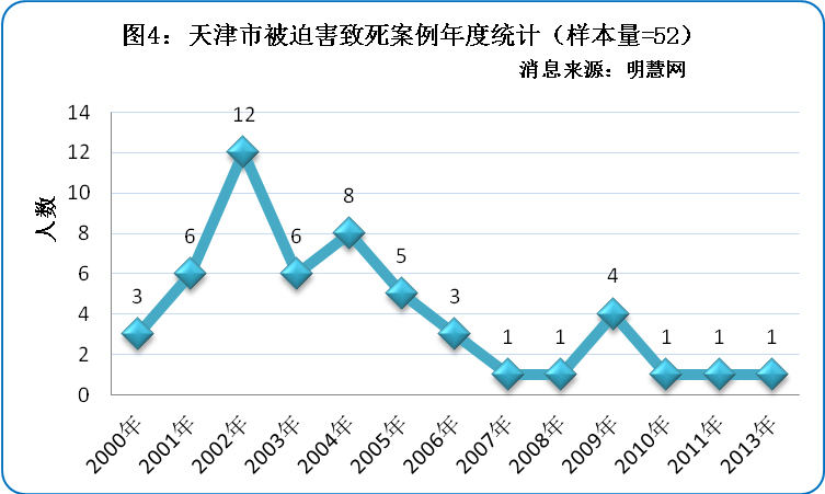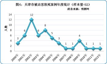 统计显示,52例被迫害致死案例中,2001-2005年这5年间迫害致死合计37人,占样本量的71%。