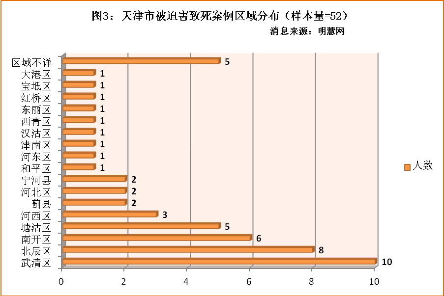 统计显示,武清区、北辰区的法轮功学员被迫害致死人数最多,合计18人,占样本量的35%。