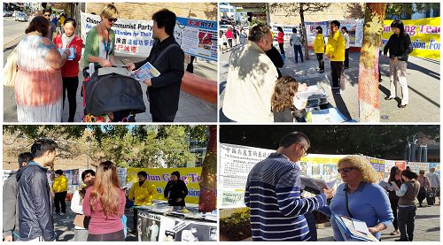法轮功学员们在马路两旁真相横幅之间穿梭,忙着帮华人做“三:退.”。明真相的华人一边谴责中共、一边乐呵呵地做着“三:退.”。