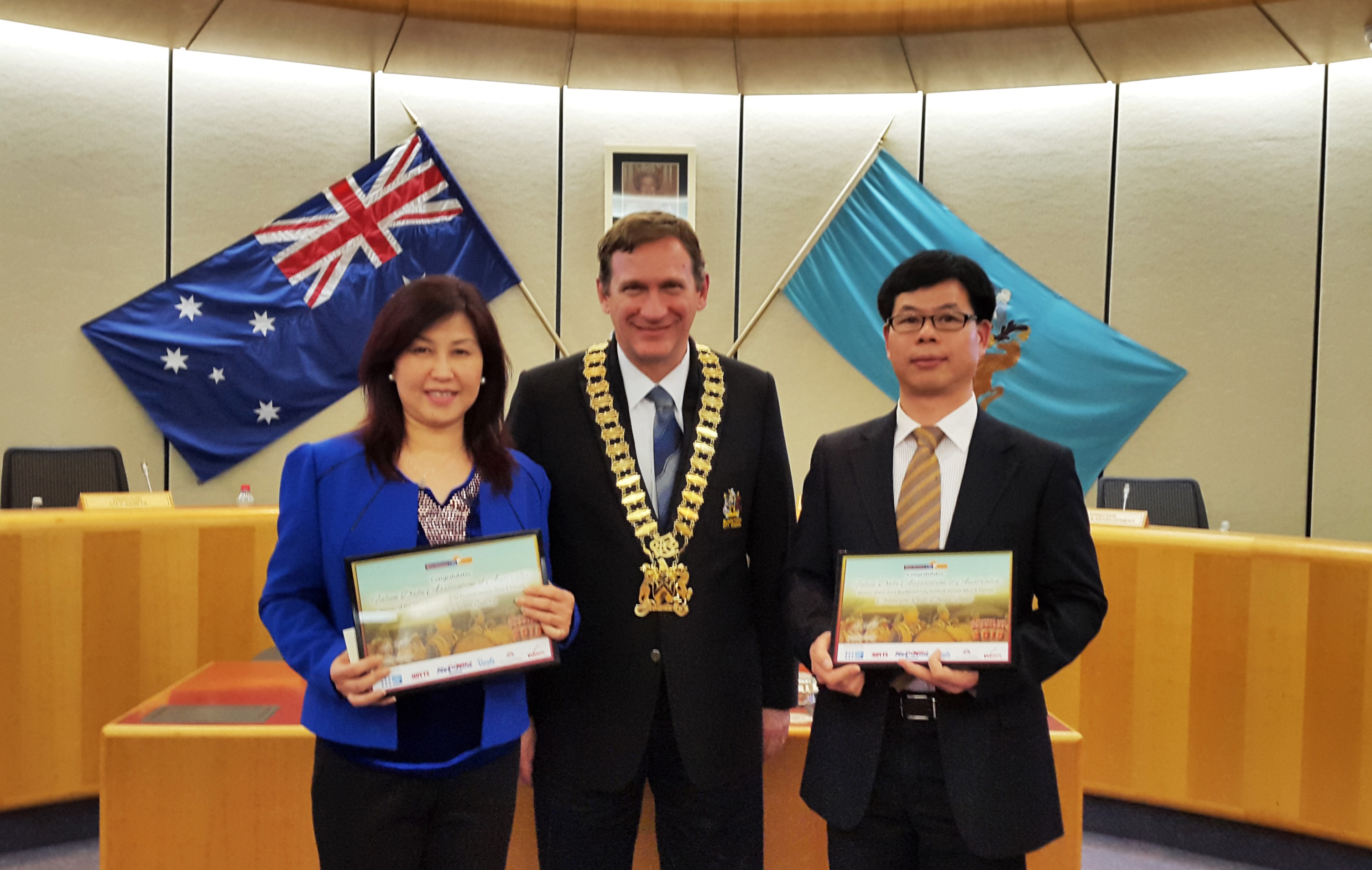 ![]() 图1:黑镇市长斯蒂芬·巴厘先生(Stephen Bali,中)授予澳洲法轮大法学会二零一五年黑镇城市文化节游行活动“最佳乐团”和“最佳服饰”两个大奖 |