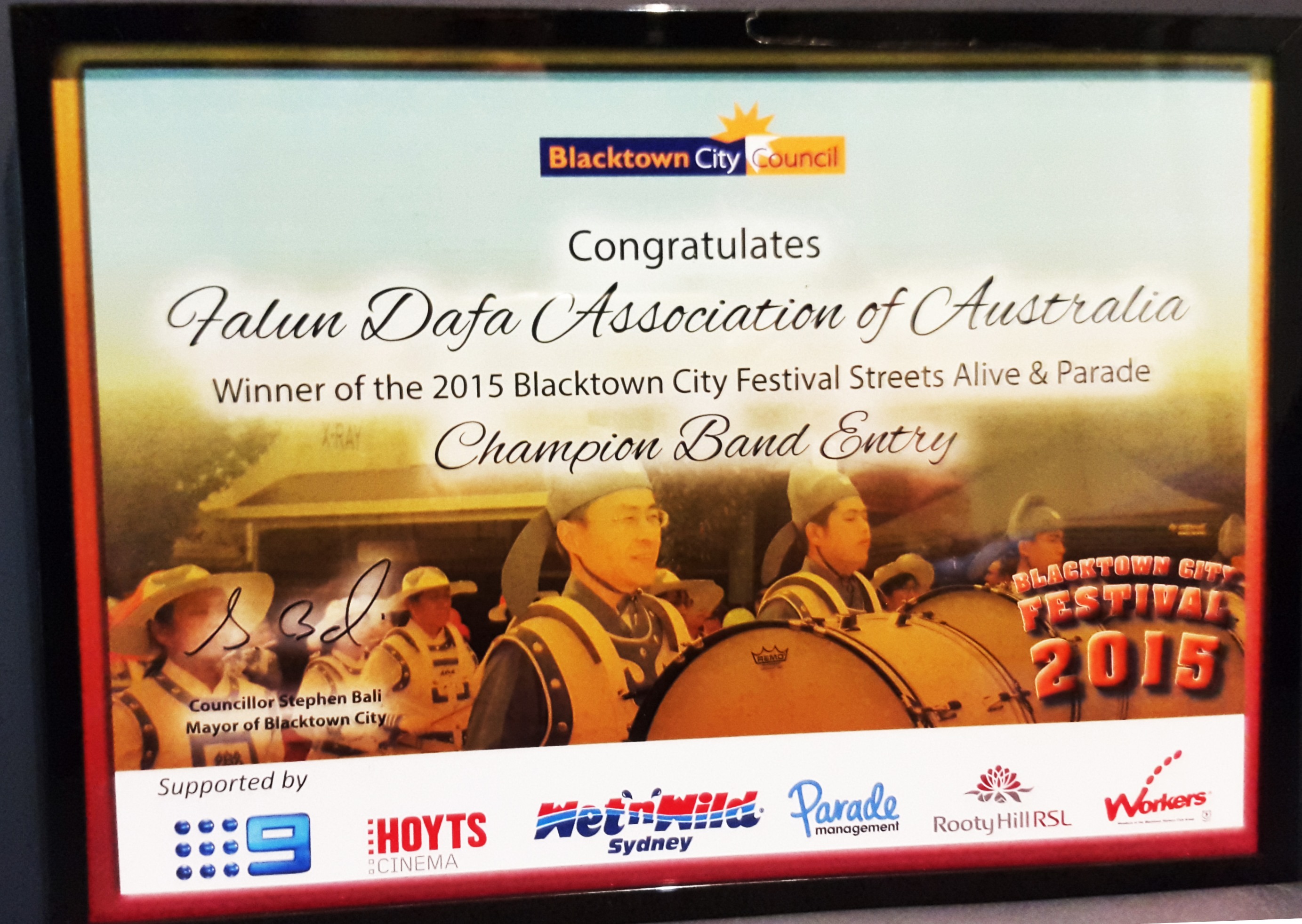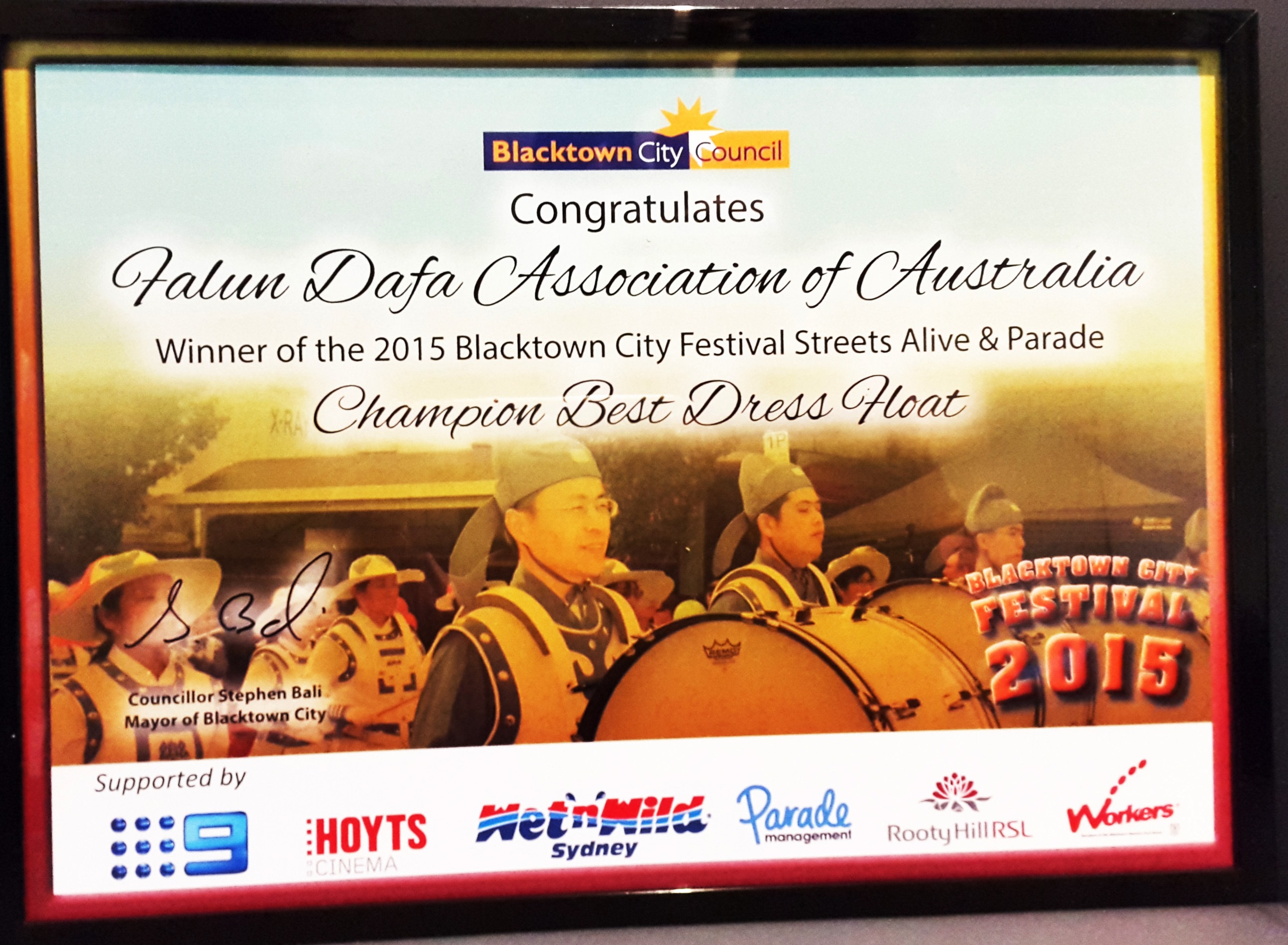 法轮大法当地游行团队协调人约翰(John Zhuo)先生表示:我自己在修炼法轮功中身心受益,明白法轮功是很好的功法。然而中共江泽民在一九九九年七月开始发动迫害法轮功,它在全世界对法轮功造了很多谣言。我当时就在想:怎么才能让西方社会的人们明白法轮功是很好的,真、善、忍是好的,不是中共宣传的那样。那么怎么做呢?当时看到人们在文化节(Festival)中摆摊位,就想我们是否也可以参与摆个介绍功法的摊位,文化节有这么多人,正好可以告诉人们法轮大法的真实情况,希望这里的市民能受益于这么好的功法,能免除中共谎言的毒害。我就打电话询问这里的市政厅如何参与这个文化节, 这样二零零零年时我们就开始参与市政府举办的文化节,当年七月又参与了Doonside的文化节, 我们有介绍功法的摊位,又在舞台上展示法轮功五套功法和表演古装舞等。从那以后,我们每年都参加市政府举办的文化节,一直持续到现在,除二零一零年因下大雨而取消整个活动外,每年我们都参与,从二零零八年至今,我们的游行队伍每年都得冠军奖,今年已是第二次得双奖:“最佳服饰奖”和“最佳乐团” 。
