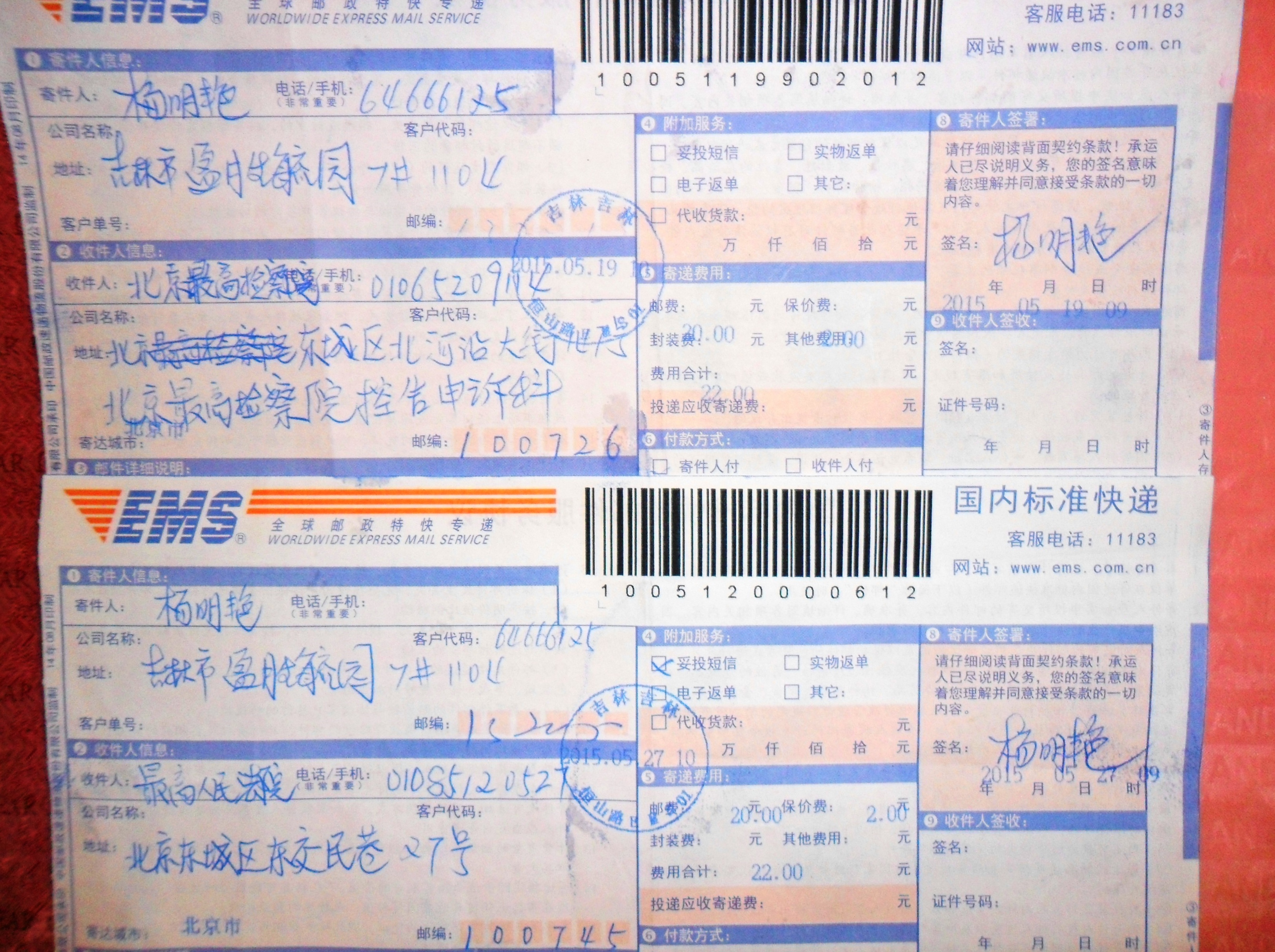 ![]() 杨明艳寄刑事诉状的回执 |