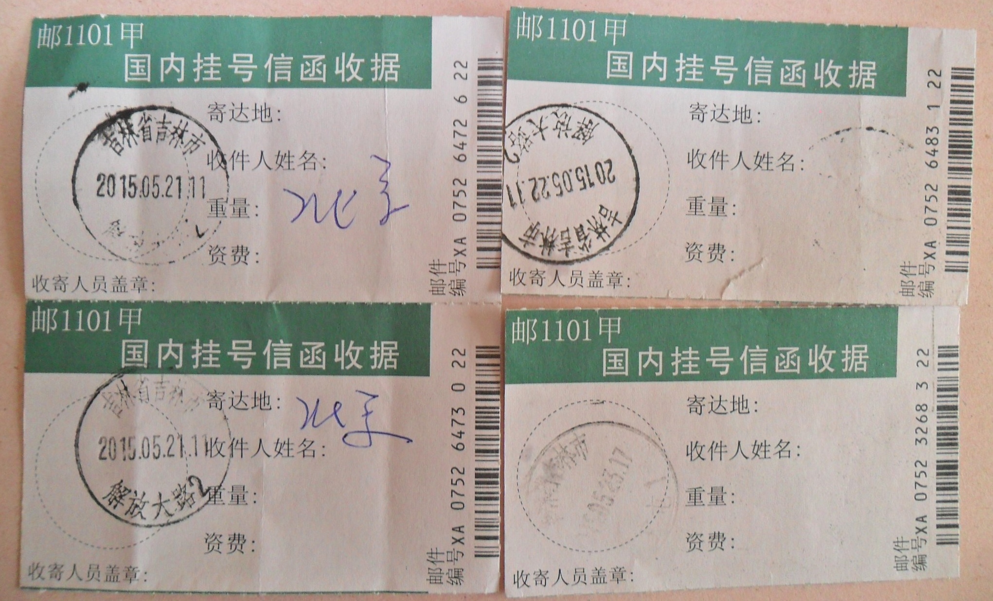 ![]() 梁宝范、刘俊梅夫妻和女儿梁晶邮寄诉状的收据 |