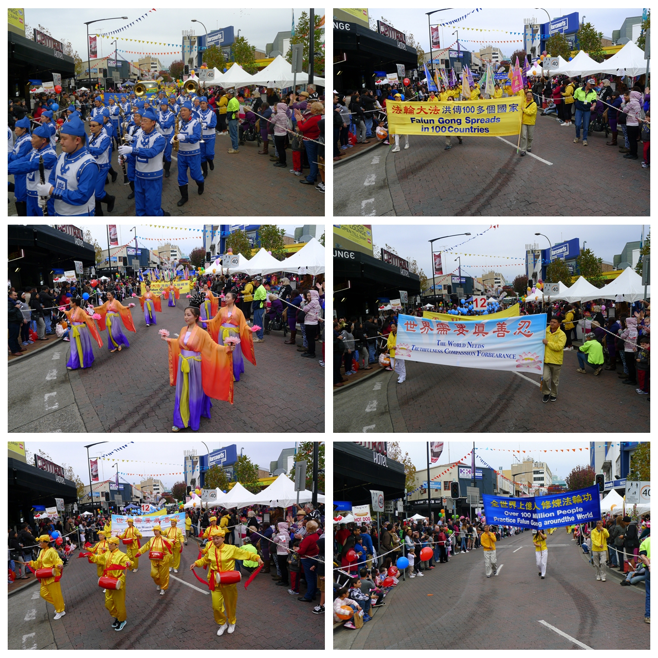 盛大的文化礼节表演队伍后面,第一组社团游行队伍就是法轮功团体。为配合当地四十年盛典,今年的法轮功队伍由众多方阵组成,也是这次游行中人数最多、色彩最丰富、内容主题最壮丽美好、最有声势的团队。他们由天国乐团、花车、仙女、彩旗阵和腰鼓队组成。“法轮大法好”,“法轮大法弘传一百多个国家”,“世界需要真、善、忍”等中英文横幅和彩旗在初秋的阳光中闪烁着光芒,赢得道路两旁市民们的掌声和赞扬声。数万名观众不但现场感受到法轮大法的美好祥和,还把这风貌拍摄回去分享给亲朋好友。