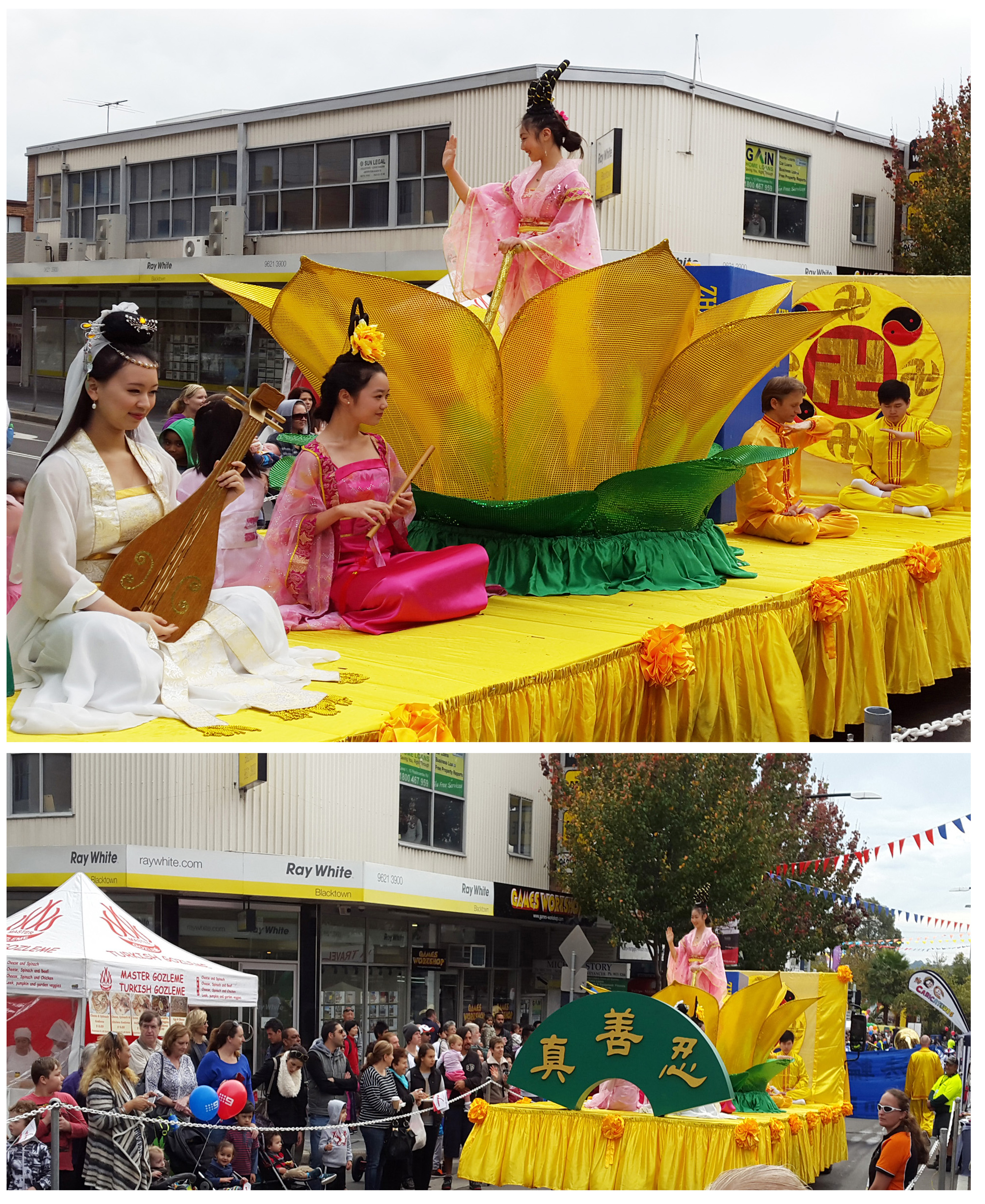 ![]() 法轮功学员精心装饰的花车受到民众热烈欢迎 |