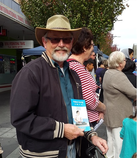 在悉尼居住颇有一段时间的华裔贵先生坐在法轮功展位旁,一边看着真相资料,一边等待着游行的开始。他对法轮功和中国现状非常了解,他表示:不管是现在还是过去,法轮功在参加游行过程中展现的是很平和、淡定的、给人一种很舒服的感觉,打个比方,如荷花在水中那种平和,没有象其他团体那样表现得很浮躁。贵先生说:作为中国人,我感觉确实很自豪,也知道他们(法轮功团体)每年都参加游行、每年都得头奖。
