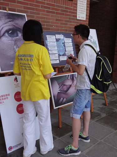 中山大学针对世界各民族对华语有兴趣的人开设了华语学习中心。来展区参观的外籍学生很多,包括美国、史瓦济南(Swaziland)、法国、厄瓜多尔、印度、日本等,他们专心聆听真善忍美展、真相图片展的导览、试穿汉服、最后签名谴责中共活摘法轮功学员器官的暴行。