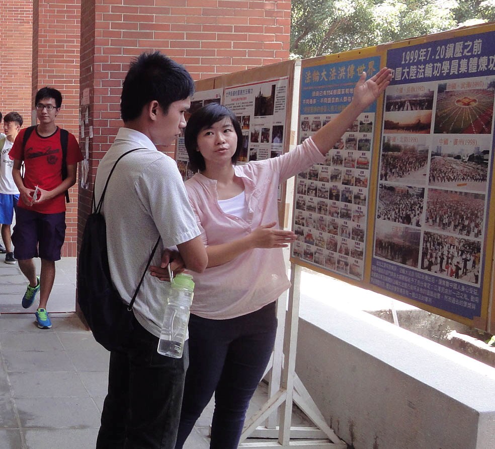 一位来自大陆的交换学生,多次经过展区,学员热情邀约并为她做导览。看完真相图片后,她改变了原先因受中共宣传的误导对法轮功的负面想法,疑团解开,态度变得很和善,转了一圈后表示:“原来法轮功是很好的。”