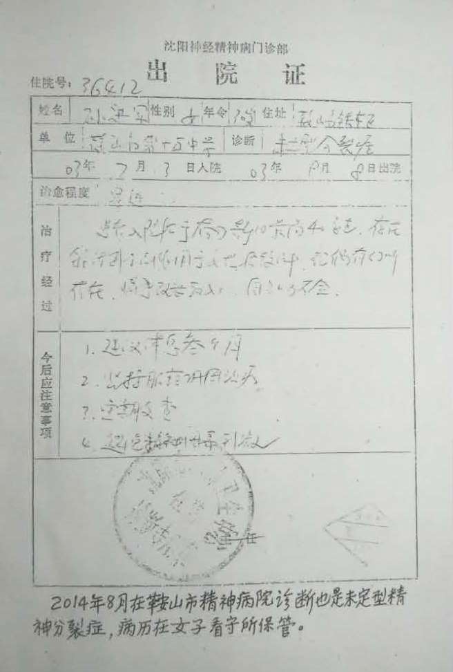 孙进军二零零三年被非法劳教,在马三家教养院受到多次的酷刑折磨,导致精神失常,被沈阳市精神病院诊断为未定型分裂症,这种分裂症是最严重的一种精神分裂症,不易治愈,而且在神经受到外界刺激之后会导致复发。
