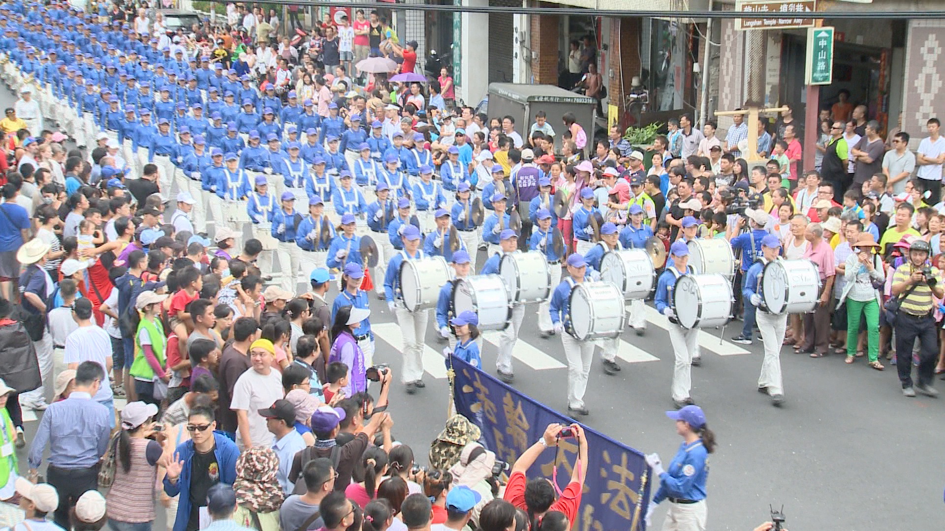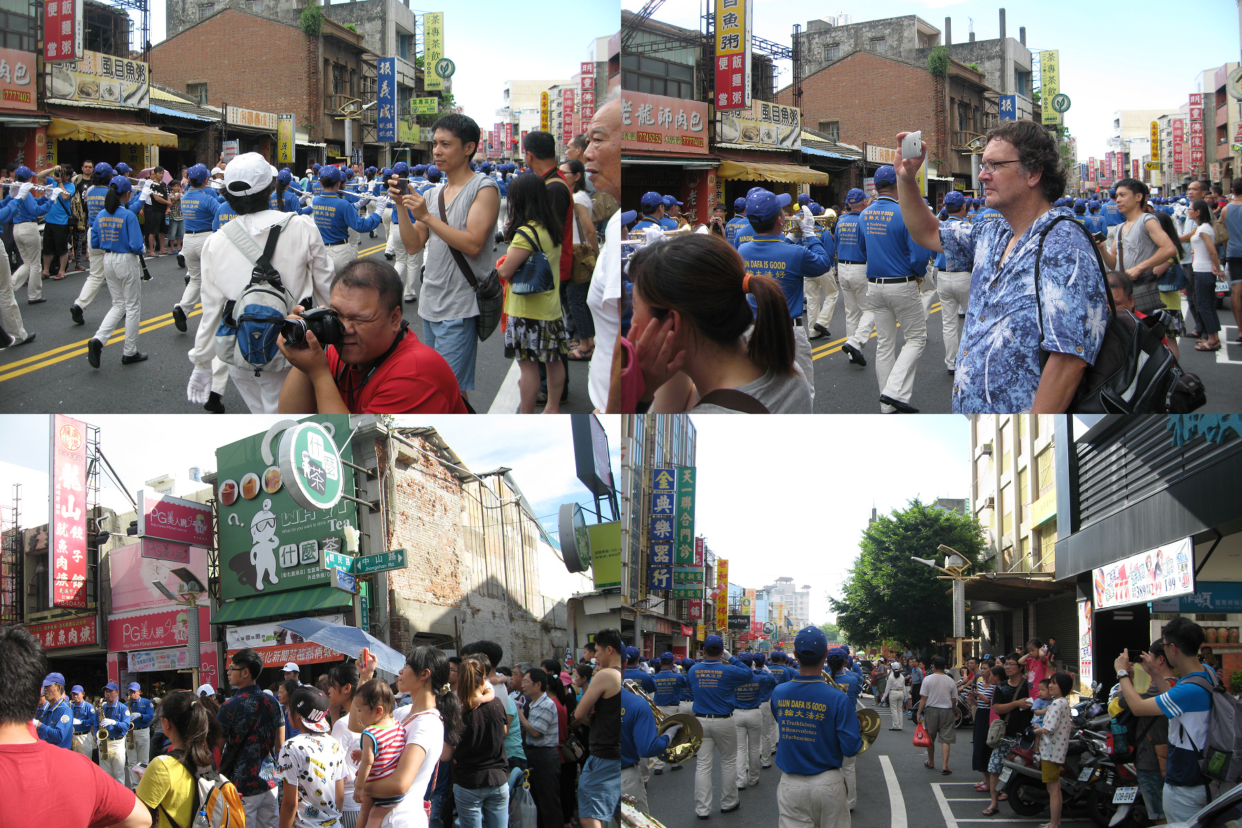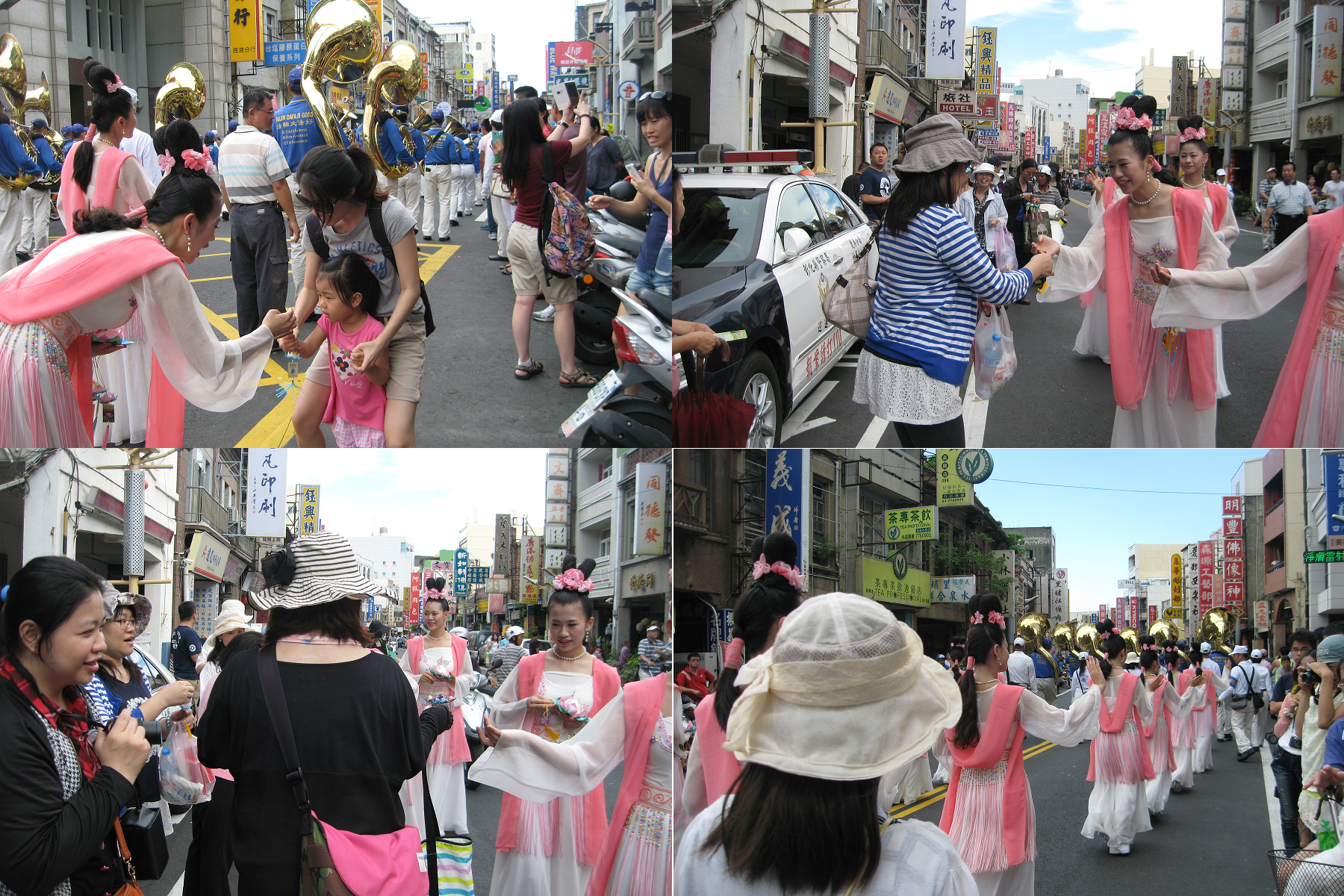 下午三点半,于鹿港文武庙前,由彰化县长魏明谷和十三支游行队伍代表敲锣启动活动。近两百人的天国乐团担任开道前导,气势壮观,沿着鹿港镇最热闹的街道行进演奏,并于定点表演。民众远远的就听到鼓乐声,在道路两侧引颈等待队伍到来。“是法轮功!”人们看到“法轮大法”的横幅在队伍前面引导,在队伍通过时纷纷拿出摄像器材来,拍下这难得一见的浩大场面。