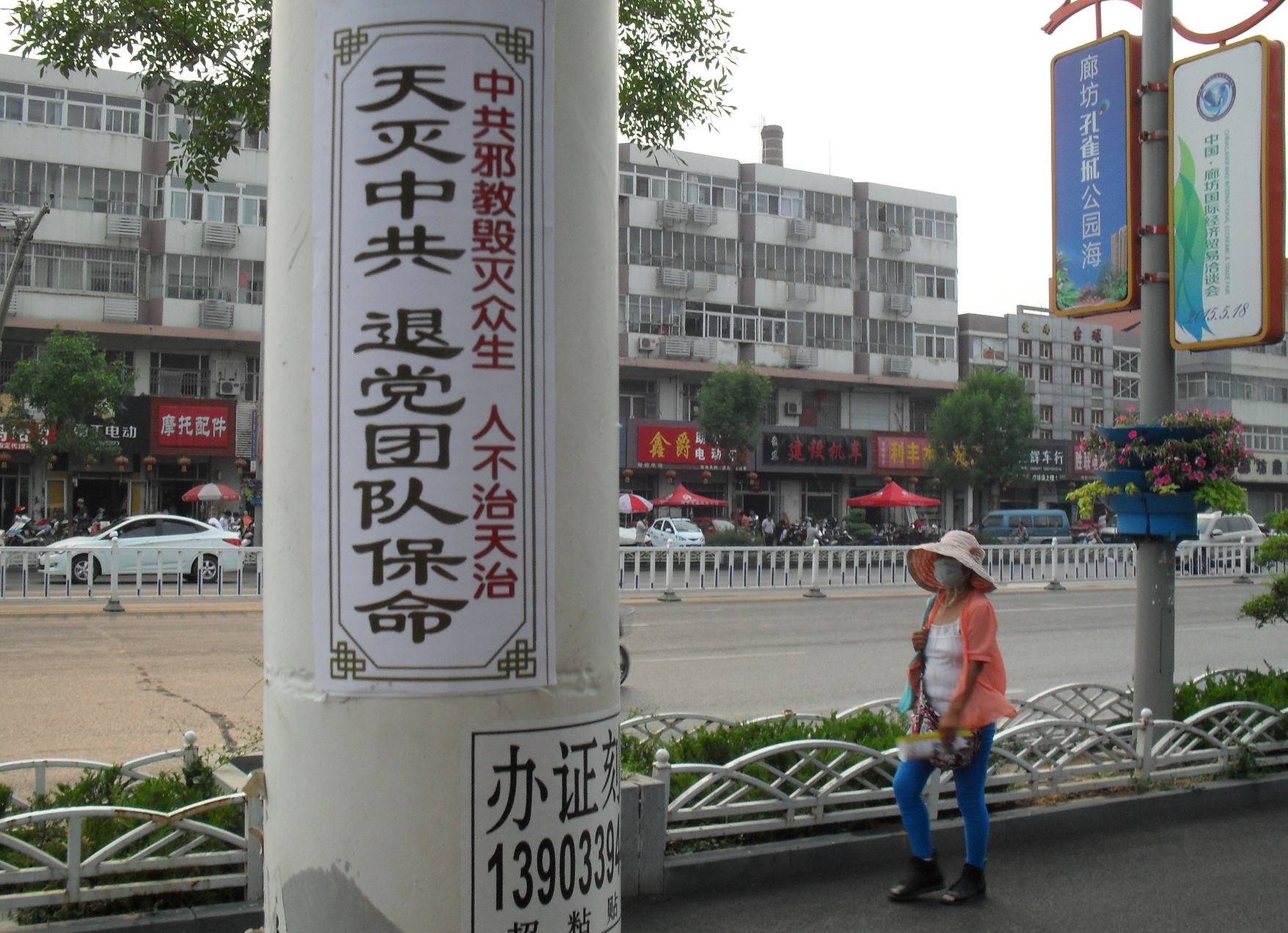 通讯员河北报道)二零一五年端午节前后,在河北省廊坊市,大街小巷可看到“全球公审江泽民”、“法轮大法好”、“真善忍好”、“诚念法轮大法好,天赐洪福保平安”、“心中牢记真善忍,幸福安康福满门”、“天灭中共,退