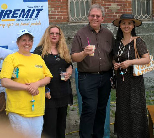 ![]() 主办方Zeman女士和代理区长Peter Erik Sas 先生(中间两位)支持法轮功学员 |