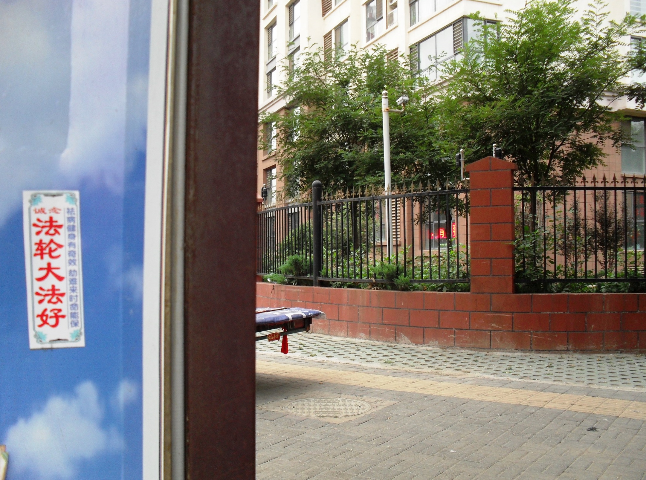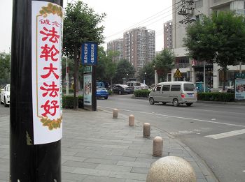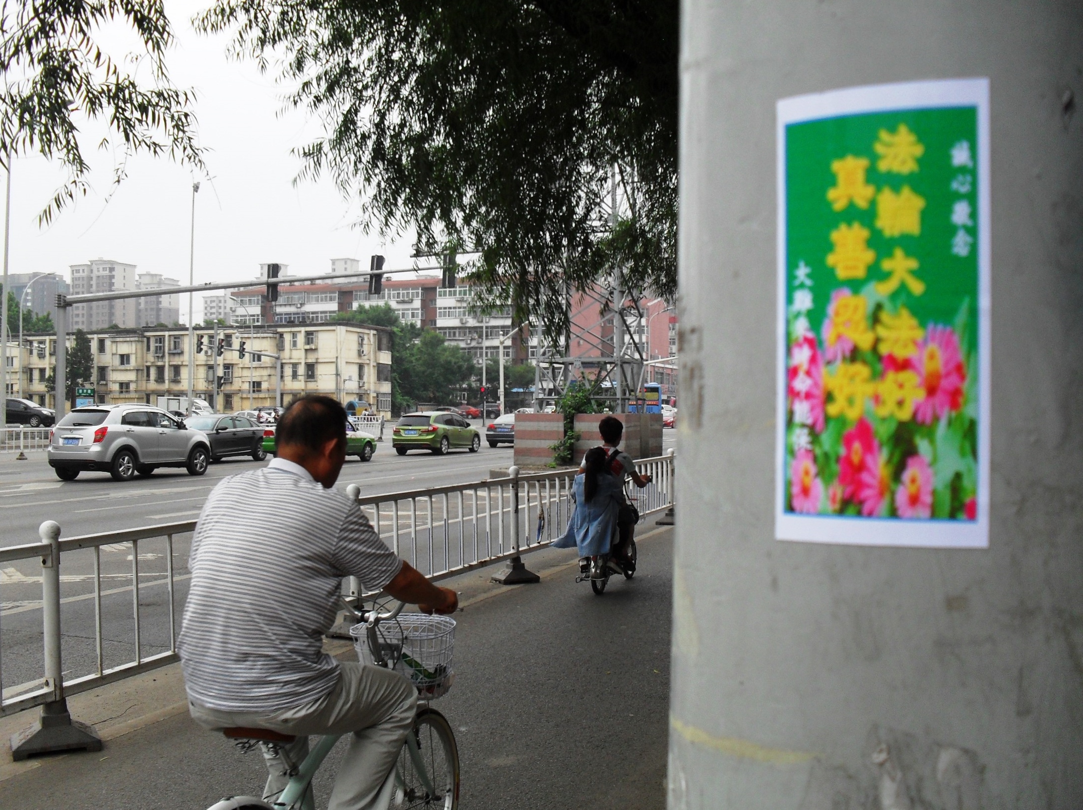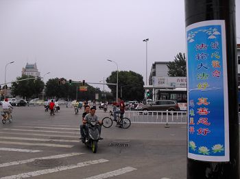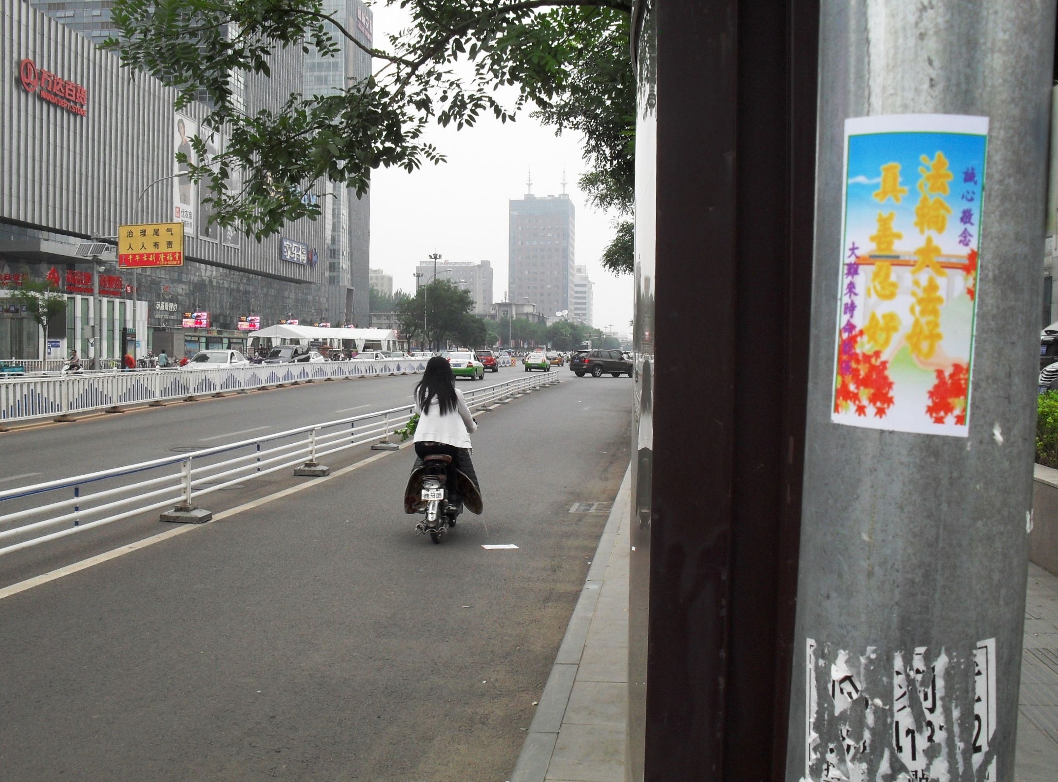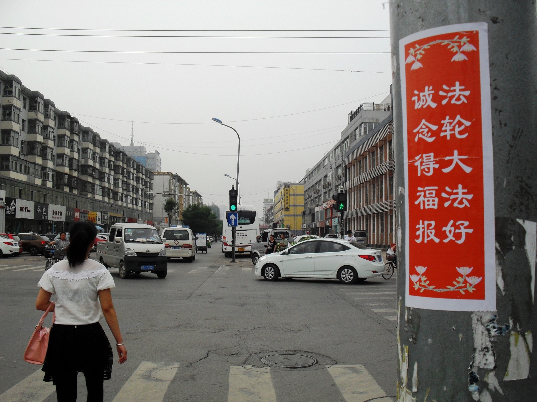 法轮功学员在十字路口等红灯的过程中,抓紧时间贴“心中牢记真善忍 幸福安康福满门”的真相标语,由于手上拿着贡品不便放到地上,只能一只手去贴,所以标语有些褶皱,就在那里整理,这时就听到有几个女士在说话,一回头四个女警察(骑电动自行车的骑警)在身后悠闲的聊着天,这时绿灯也亮了,看着她们骑过去了,赶紧拿相机拍下她们的背影。