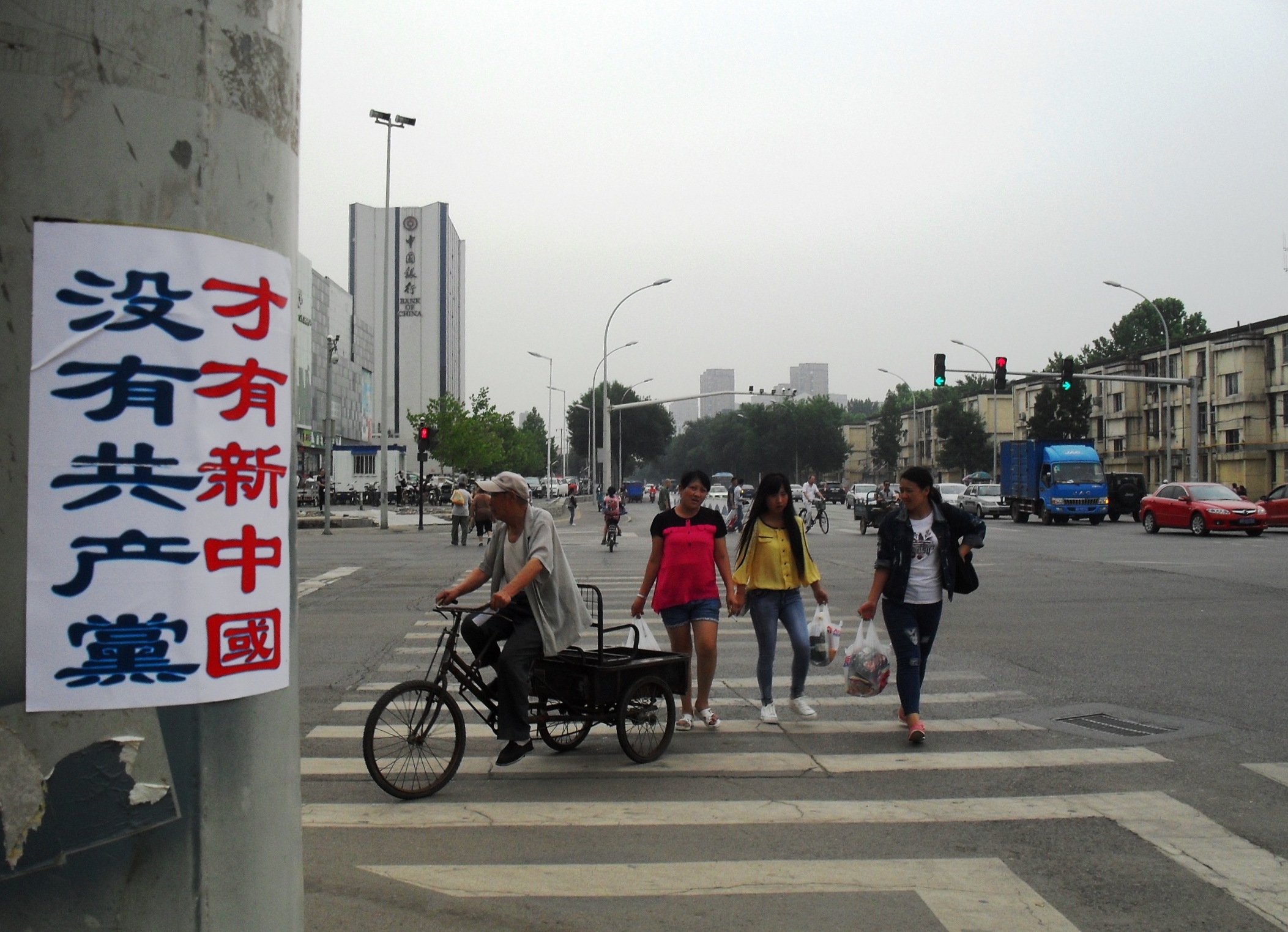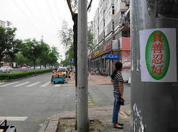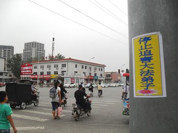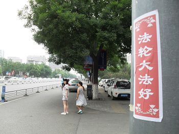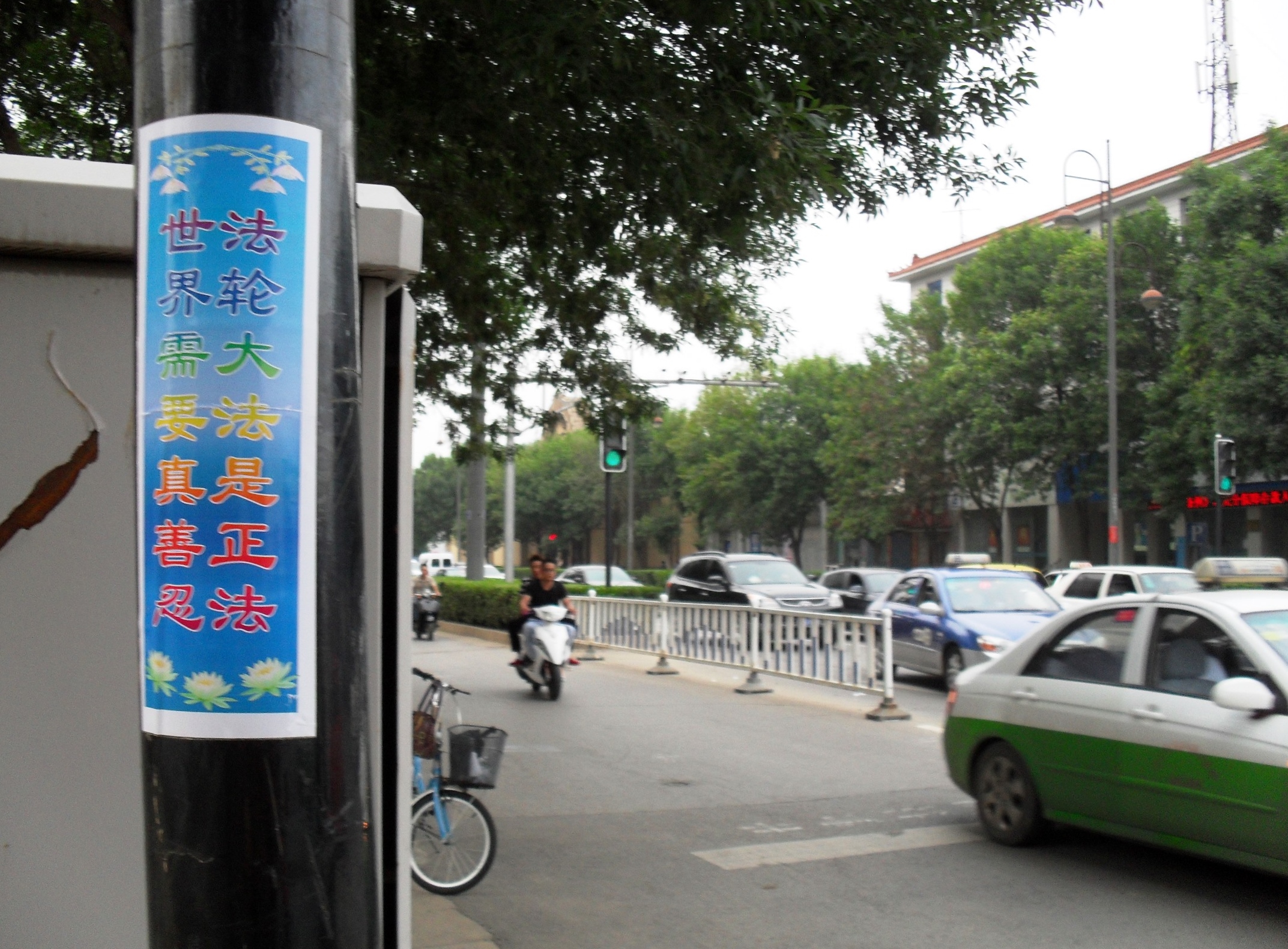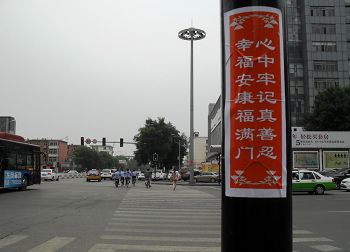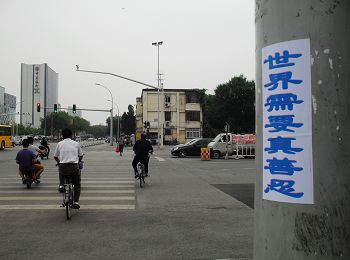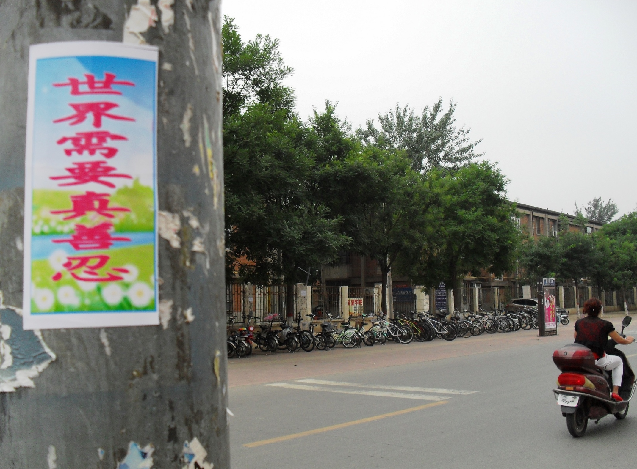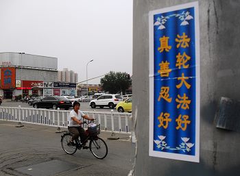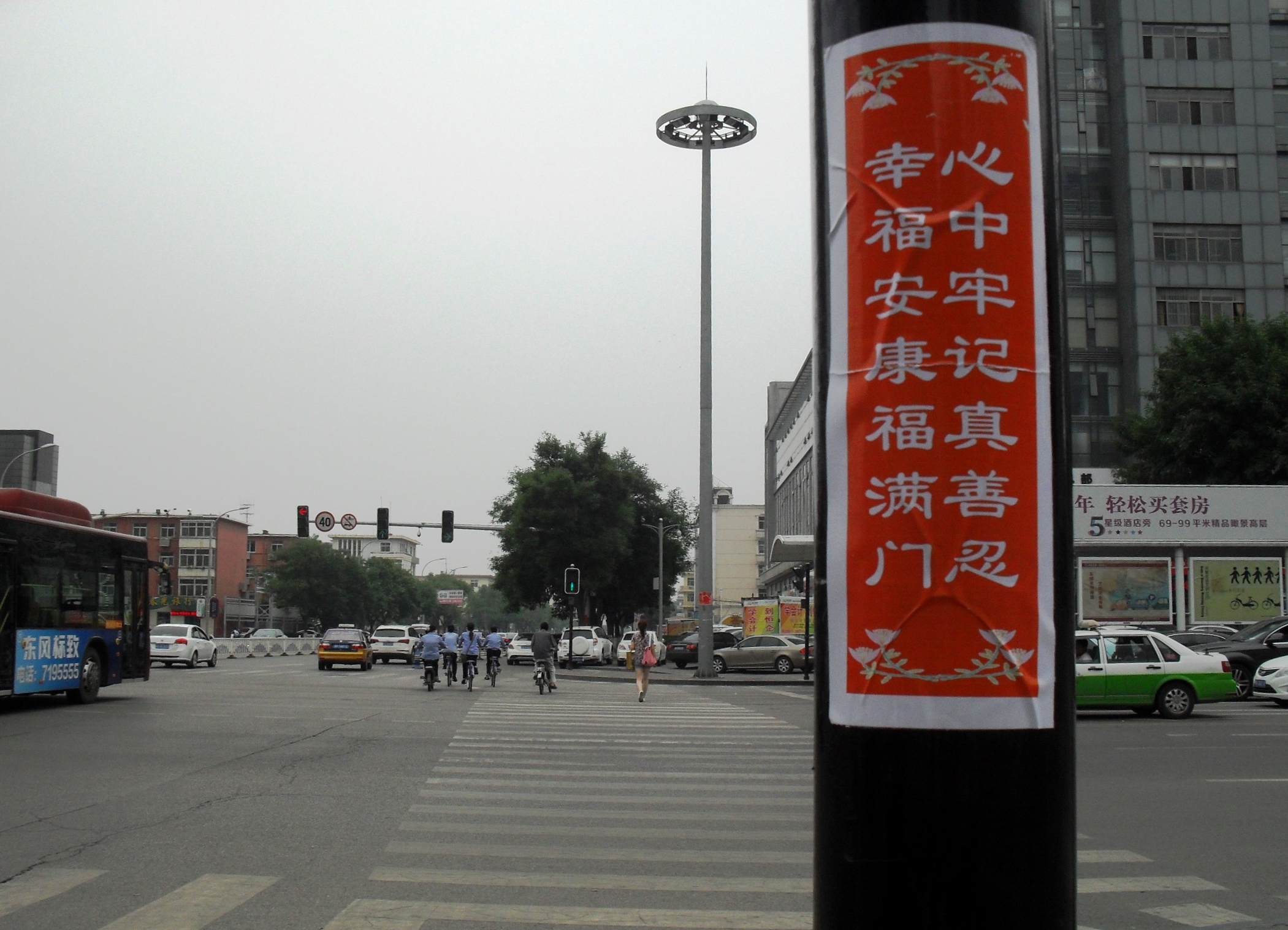 法轮功学员在十字路口等红灯的过程中,抓紧时间贴“心中牢记真善忍 幸福安康福满门”的真相标语,由于手上拿着贡品不便放到地上,只能一只手去贴,所以标语有些褶皱,就在那里整理,这时就听到有几个女士在说话,一回头四个女警察(骑电动自行车的骑警)在身后悠闲的聊着天,这时绿灯也亮了,看着她们骑过去了,赶紧拿相机拍下她们的背影。