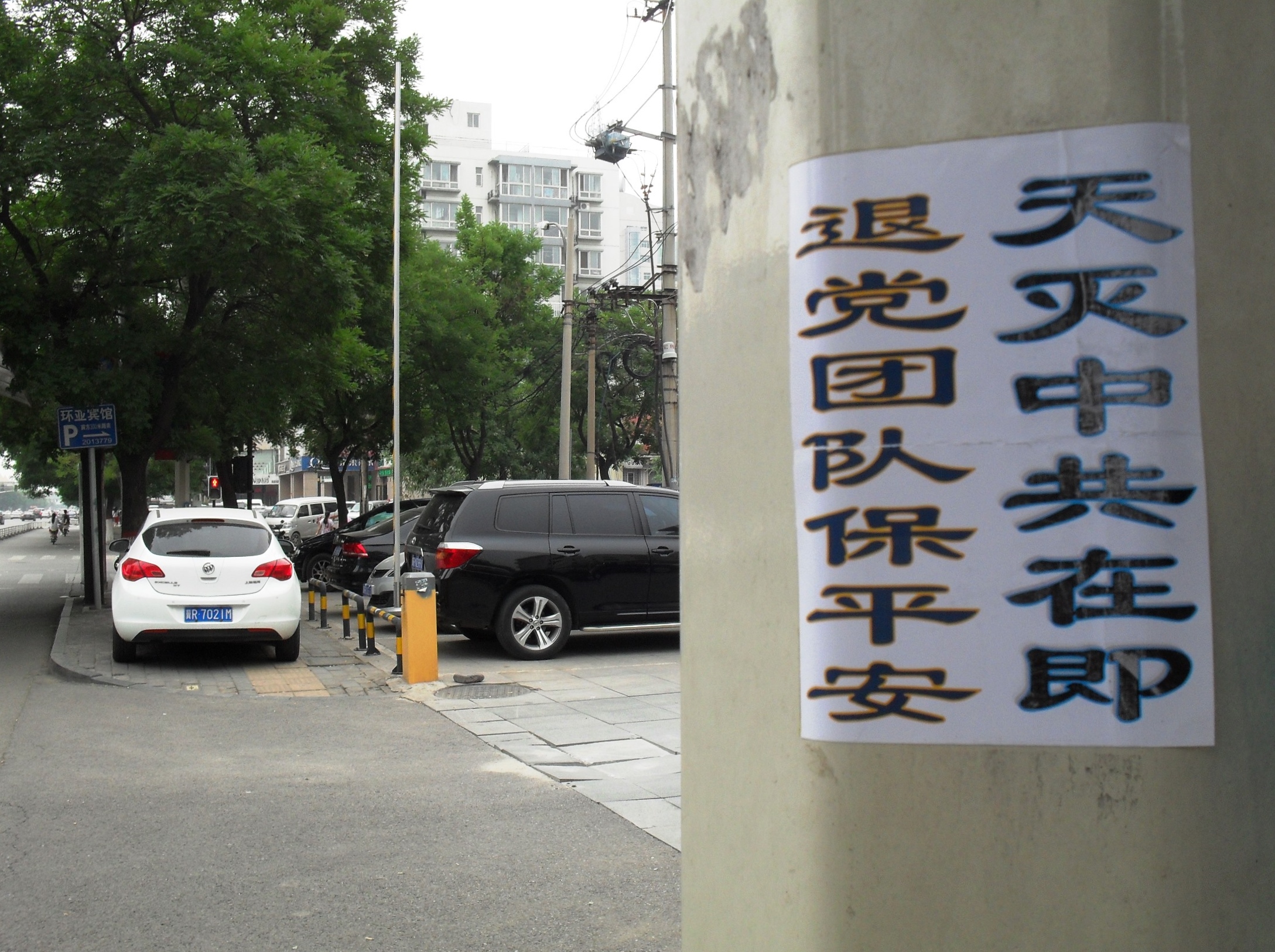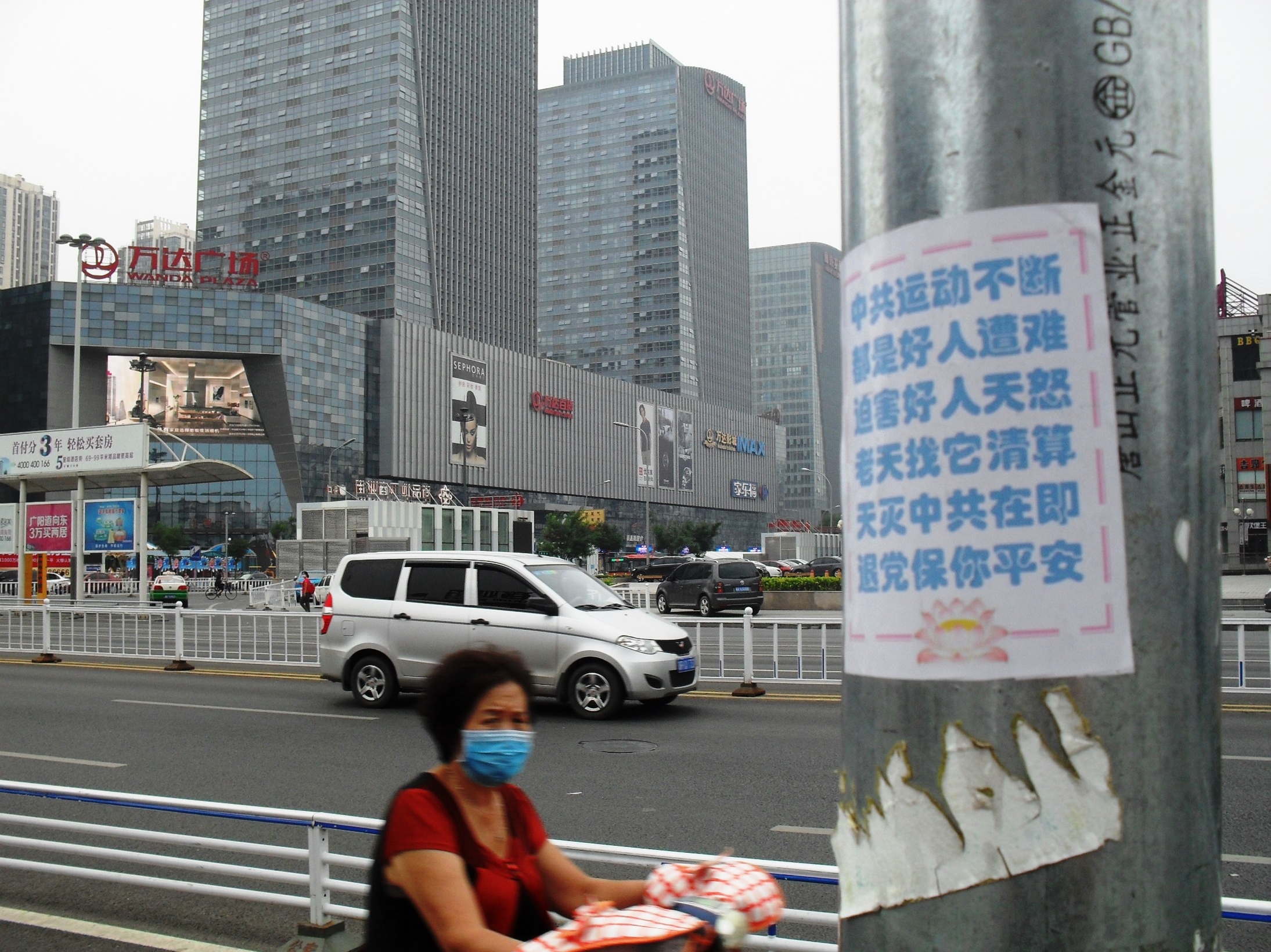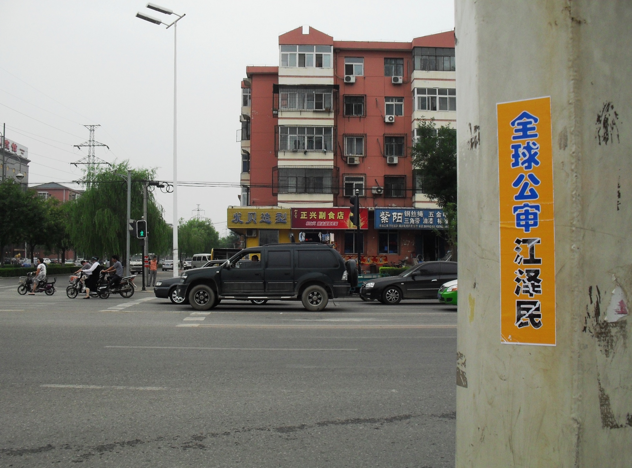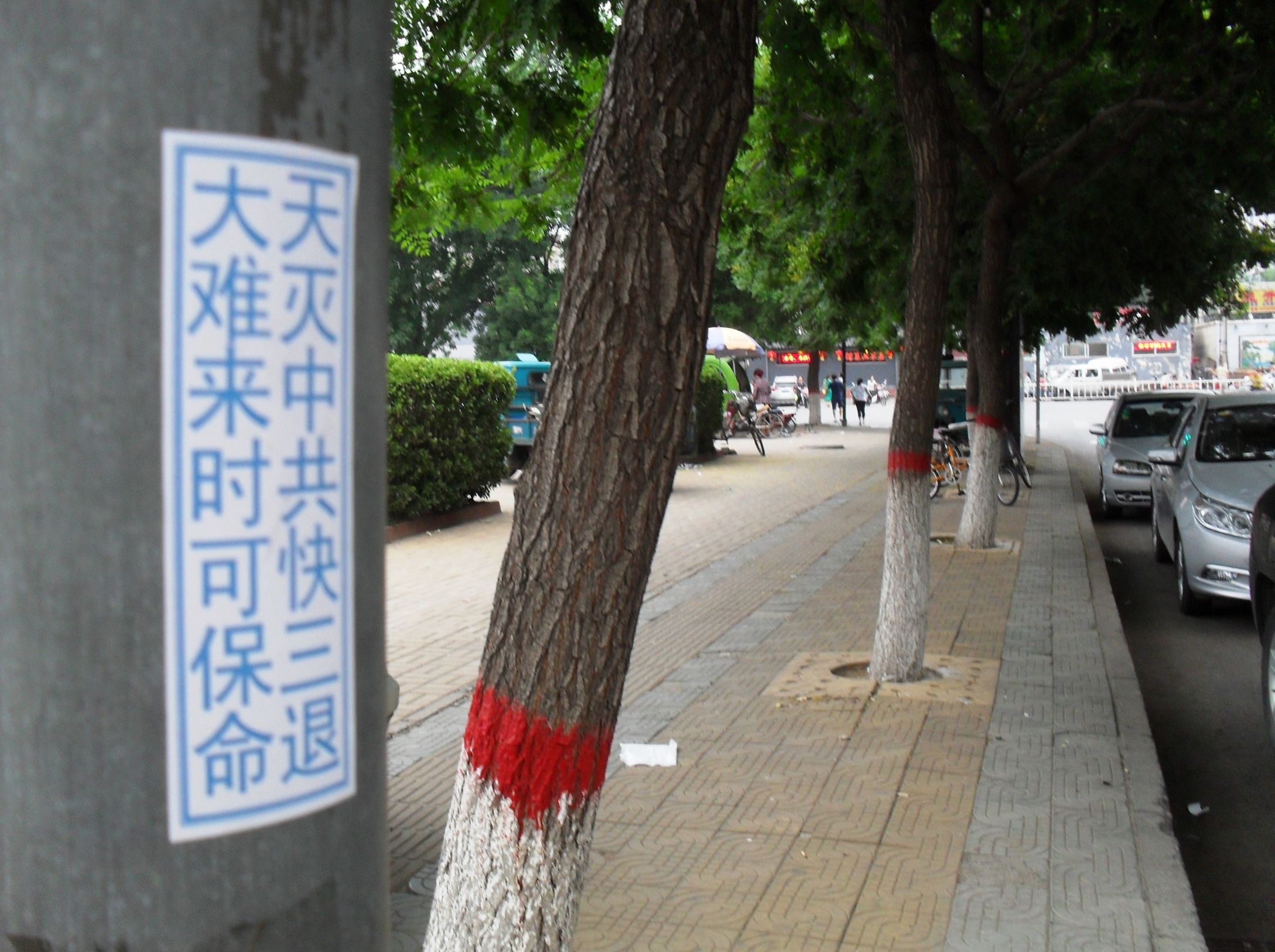 法轮功学员在十字路口等红灯的过程中,抓紧时间贴“心中牢记真善忍 幸福安康福满门”的真相标语,由于手上拿着贡品不便放到地上,只能一只手去贴,所以标语有些褶皱,就在那里整理,这时就听到有几个女士在说话,一回头四个女警察(骑电动自行车的骑警)在身后悠闲的聊着天,这时绿灯也亮了,看着她们骑过去了,赶紧拿相机拍下她们的背影。