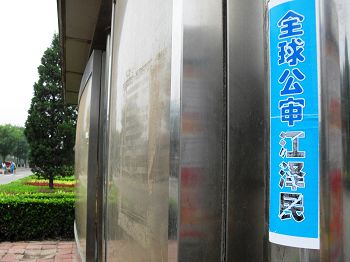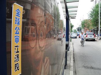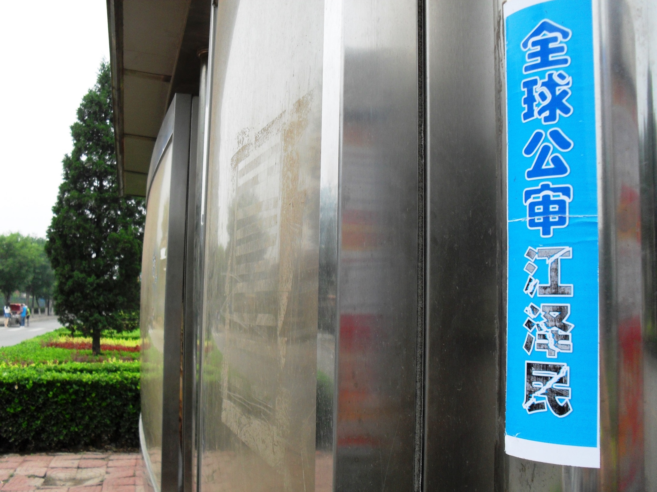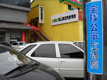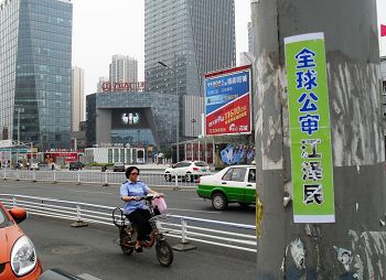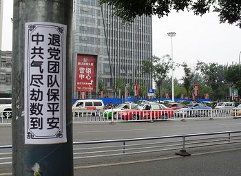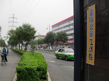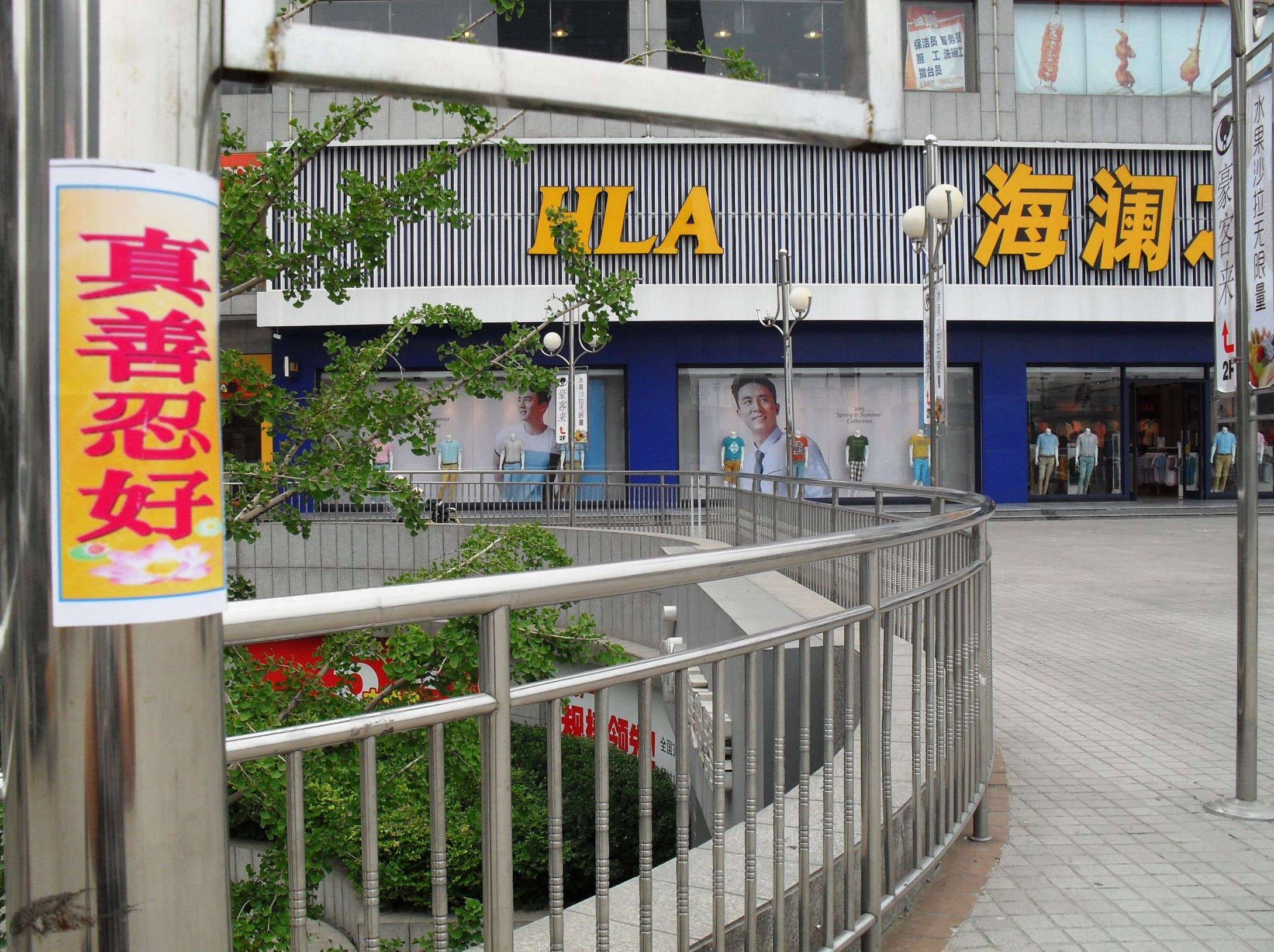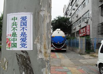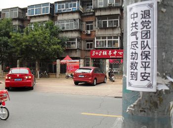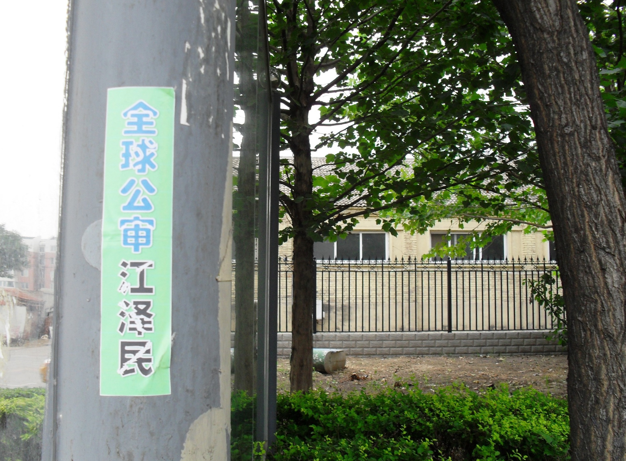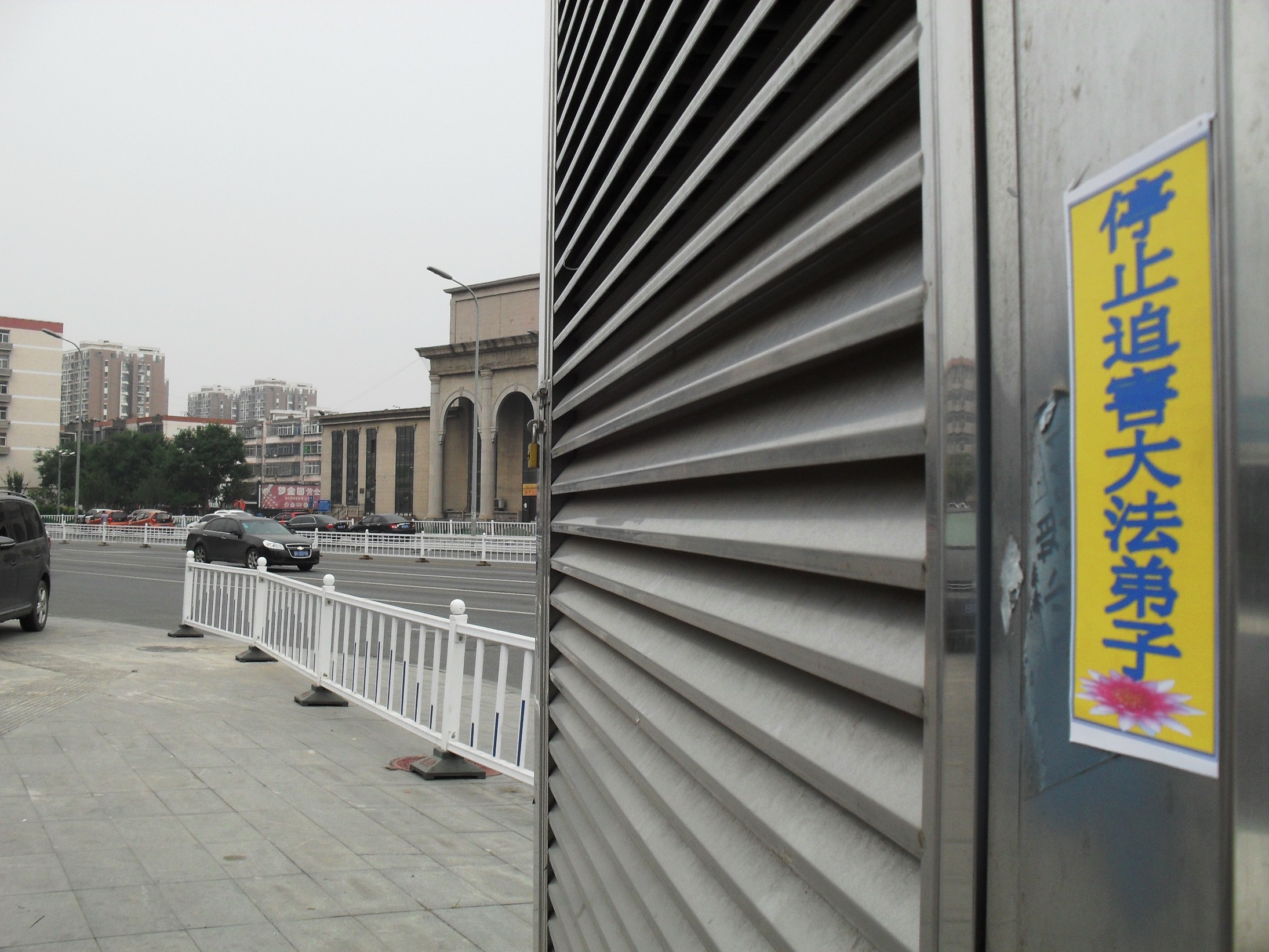 法轮功学员在十字路口等红灯的过程中,抓紧时间贴“心中牢记真善忍 幸福安康福满门”的真相标语,由于手上拿着贡品不便放到地上,只能一只手去贴,所以标语有些褶皱,就在那里整理,这时就听到有几个女士在说话,一回头四个女警察(骑电动自行车的骑警)在身后悠闲的聊着天,这时绿灯也亮了,看着她们骑过去了,赶紧拿相机拍下她们的背影。