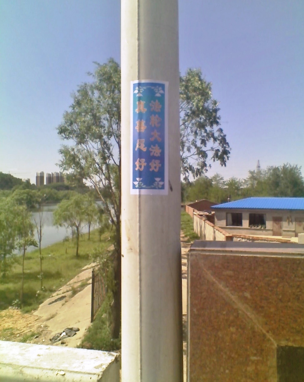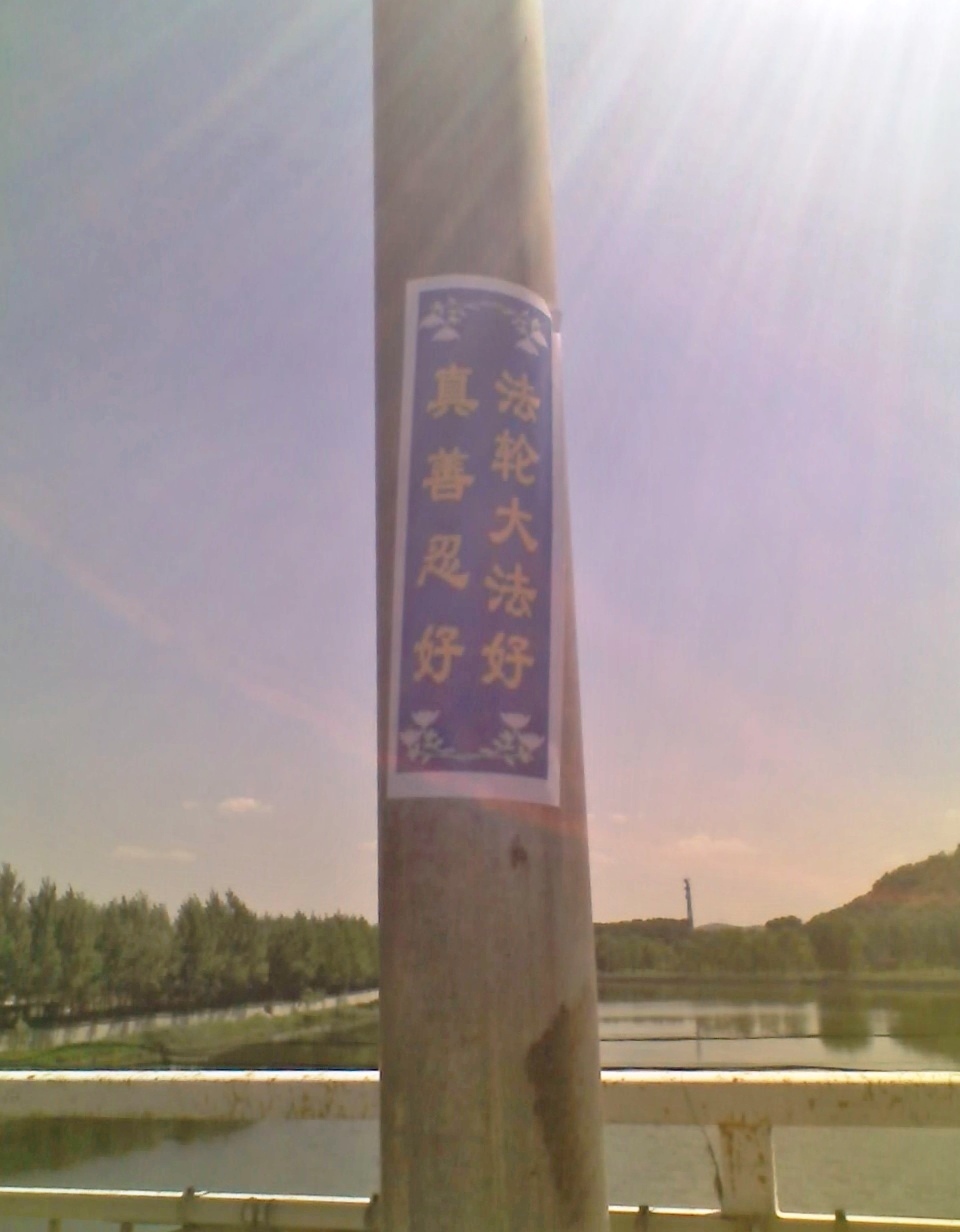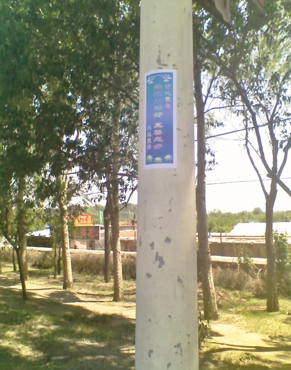 二零一五年六月初,辽北城市街道及楼群都看见到“全球公审江泽民”、“法轮大法好”、“心中牢记真善忍,洪福常伴善良人”等真相标语。