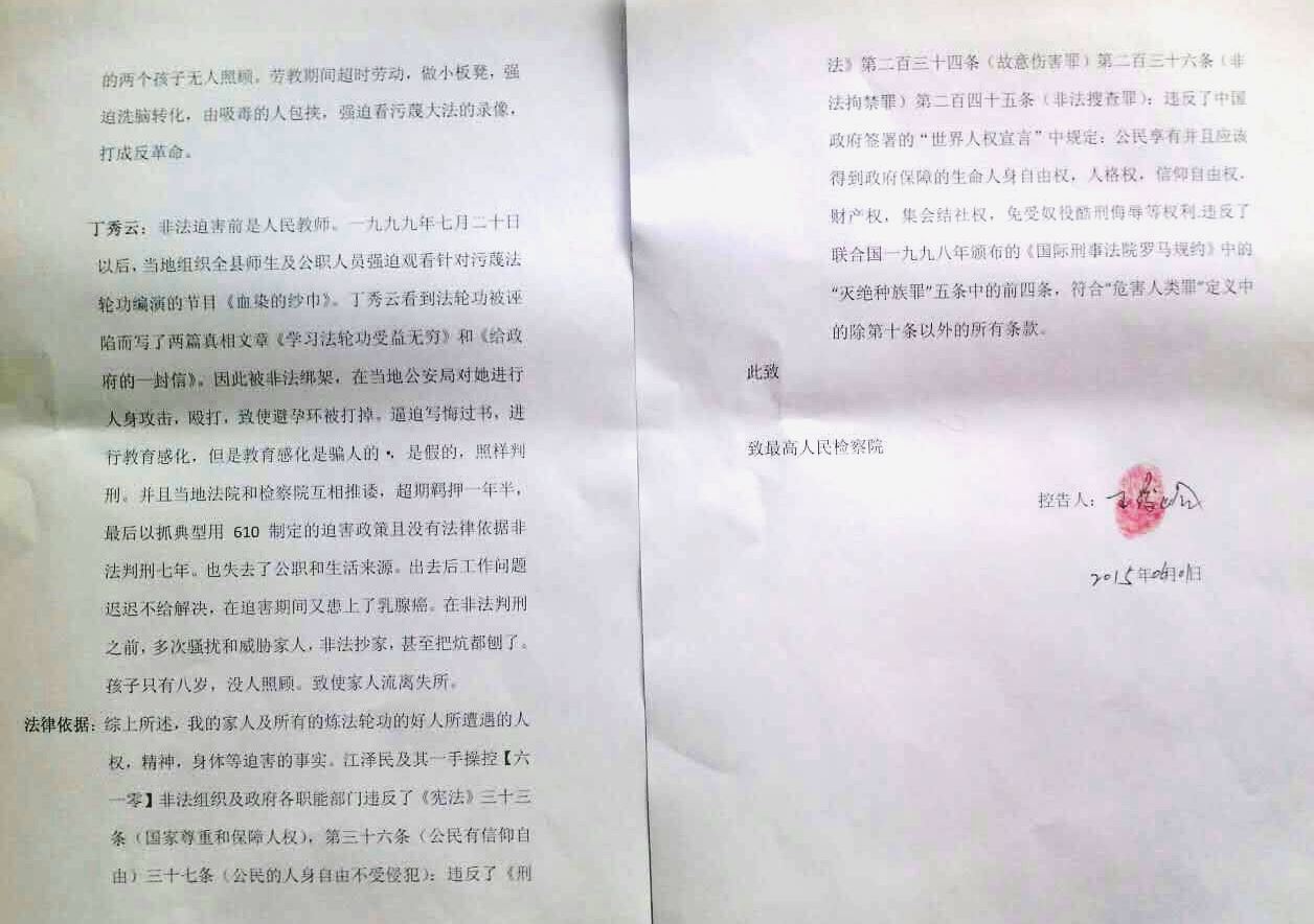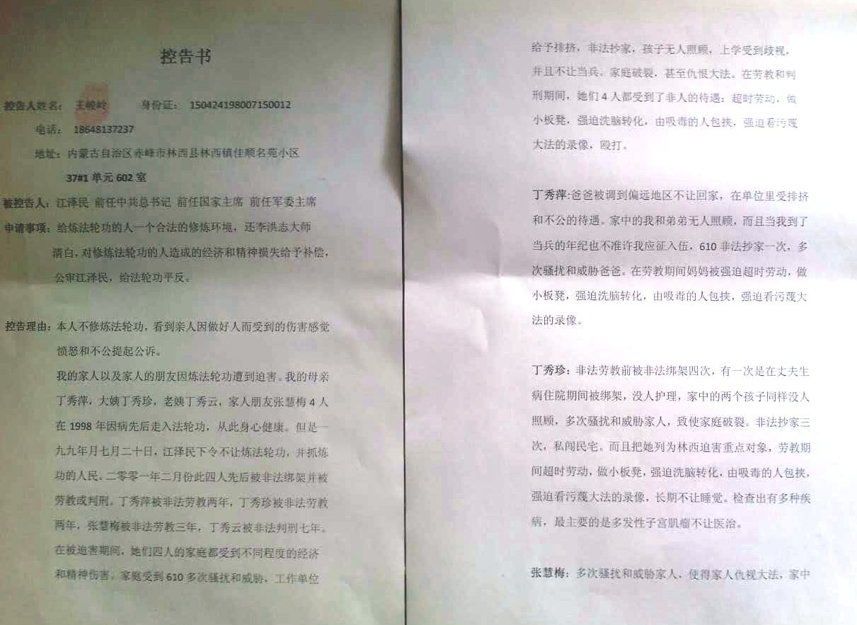 这些法轮功学员及家属已将控告书和相关资料邮寄到中国最高检察院、最高法院,起诉江泽民发起对法轮功的迫害运动,导致他们遭到绑架、抄家、勒索、拘留、劳教、判刑,遭酷刑折磨,被剥夺工作,被剥夺生存权利,孩子受到歧视、亲人在迫害中离世。