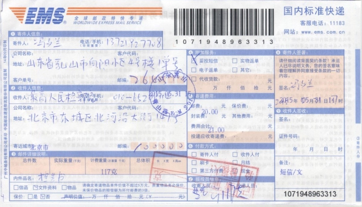 山东青岛法轮功学员蔡颖已于二零一五年五月三十日将控告前中共头子江泽民的《刑事控告书》用EMS快递寄给最高检察院。在江泽民发动的这场迫害中,蔡颖在二零零八年三月二十七日被平安路派出所警察绑架、抄家,后被四方区法院非法判刑三年,在青岛大山看守所和山东女子监狱关押期间,遭到洗冷水澡、殴打、不让睡觉、不让上厕所、灌食、长时间坐小凳、长期打地铺等迫害。二零一二年八月,蔡颖在西藏被绑架,后被拘禁在绍兴路洗脑班一个月,遭迫害性灌食,流食呛进气管中,差点死去。