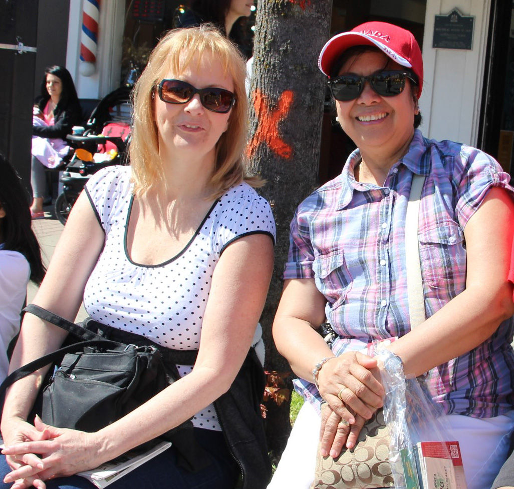 姐妹俩Dale(右)和Hellen 跟着乐团的音乐起舞和鼓掌,Dale说:“我们是老观众了,近几年来都观看这个游行,都能看到法轮功的队伍,我们都特别地高兴。”妹妹Hellen说:“我也是非常喜欢这个乐团,他们很鼓舞人心。”但得知这个团体在中国是没有自由时,她们都很惊讶,她们接过传单后表示一定会上网查资料了解真相。