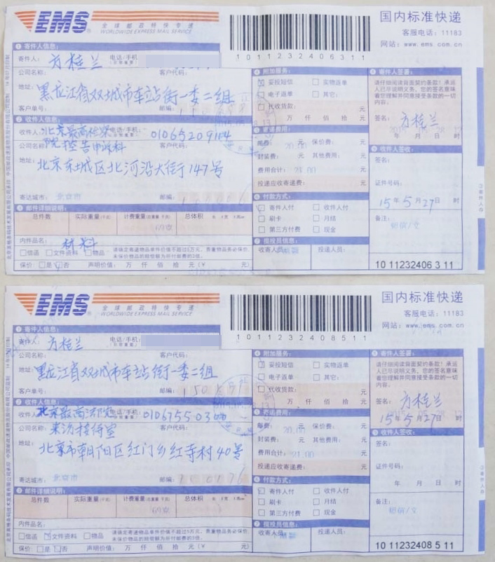 方桂兰的刑事控告状于二零一五年五月二十七日通过特快专递寄往北京最高法院和北京最高检察院,五月二十九日接收到邮政部门发布收到邮件的信息。