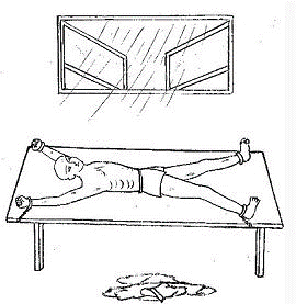 因凌源监狱强迫大法弟子做机械活和做地毯等重奴役活,徐大为绝食反迫害,遭野蛮灌食,多次被送严管队酷刑折磨。第一次送小号时,被上大挂,在平板床上用8#铁丝,呈大字形仰卧,四个方向抻开,抻到最极限,二十四小时都挂着,大、小便都在床上。不洗脸,泪水、汗液把眼睛腌渍的受不了。一般人三天就承受到了极限了,徐大为第一次就被挂了七天,后来又多次遭到这种酷刑。