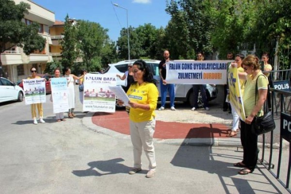 七月十三日上午,法轮功学员们聚集在中共使馆前,打出“法轮大法好”、“制止中共对法轮功的迫害”等中、土文横幅,以和平的方式举行了抗议集会活动,抗议中共对法轮功长达十六年之久的迫害行径,尤其是中共活摘法轮功学员器官牟利的暴行,同时,呼吁制止中共对法轮功学员所实施的非人暴行。