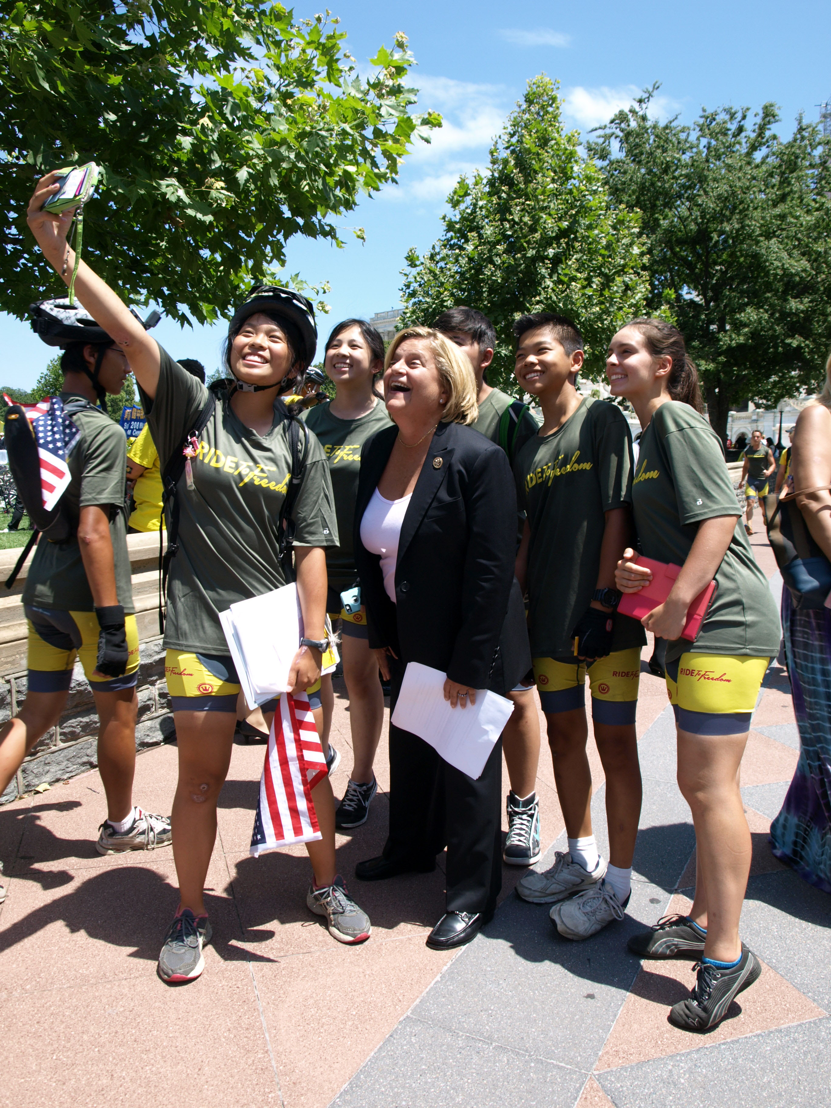 七月十六日下午,维吉尼亚州国会众议员芭芭拉·康姆斯托克(Barbara Comstock)在办公室接待了十三岁的骑手纯净·纽曼(Chunjing Neumann),欢迎他成功结束单车之旅。纯净住在康姆斯托克议员的选区。