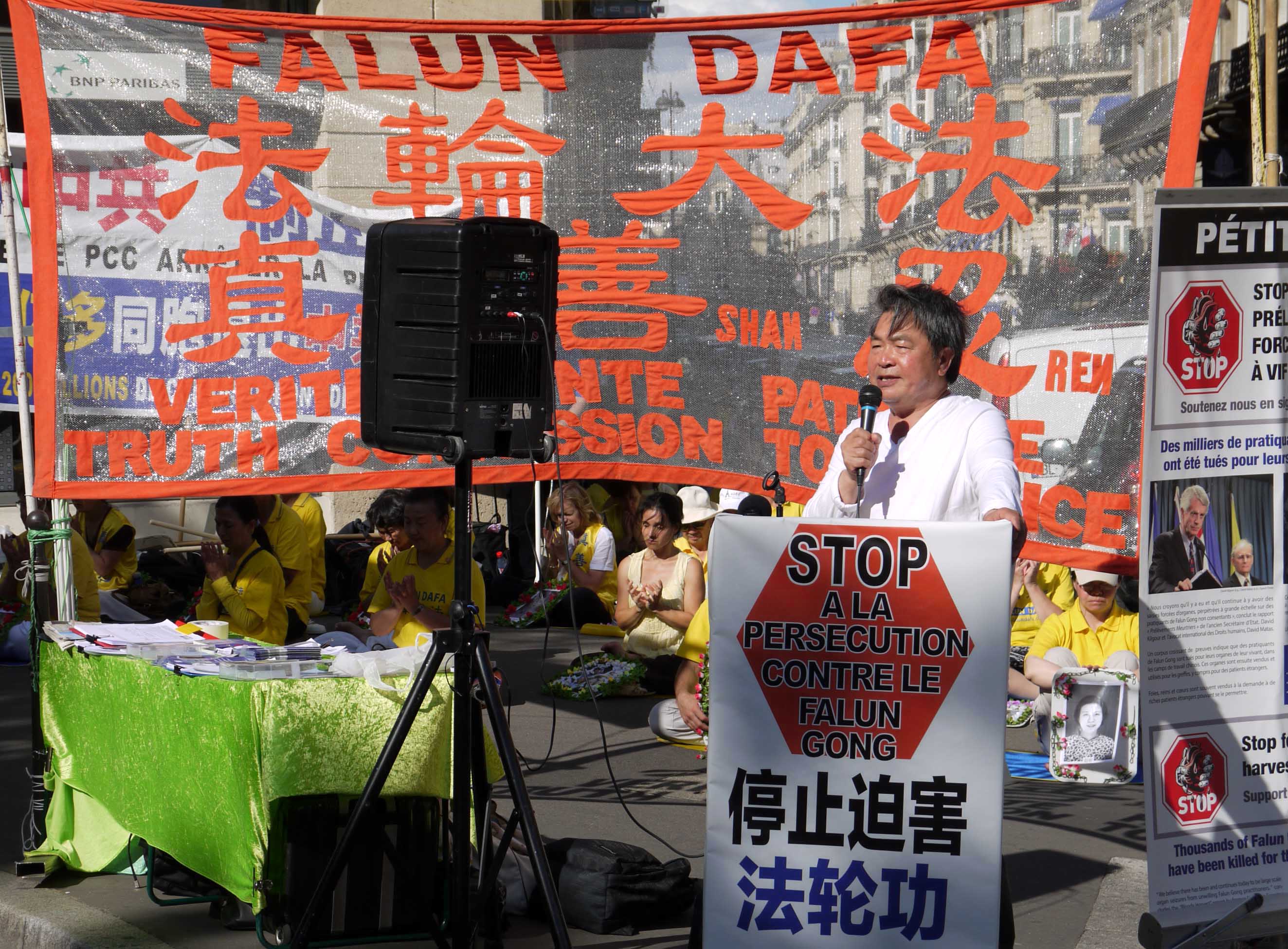 ![]() 图5:集会上,医生反对活摘(DAFOH)法国代表Arold KING先生揭露了中共活摘法轮功学员器官的罪行。 |