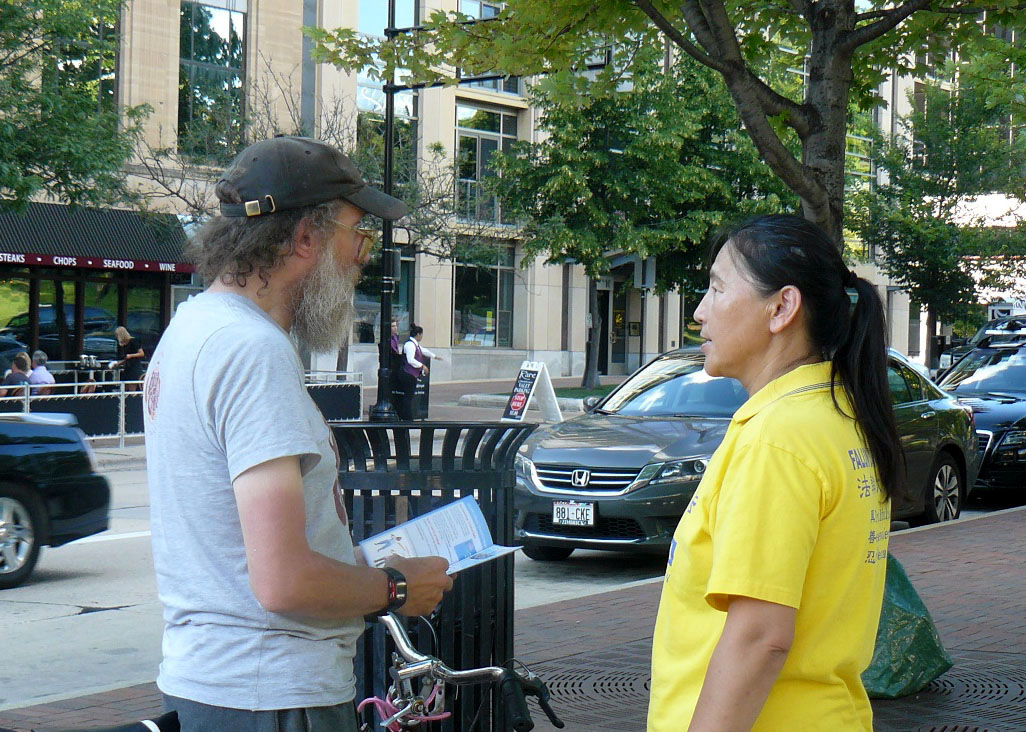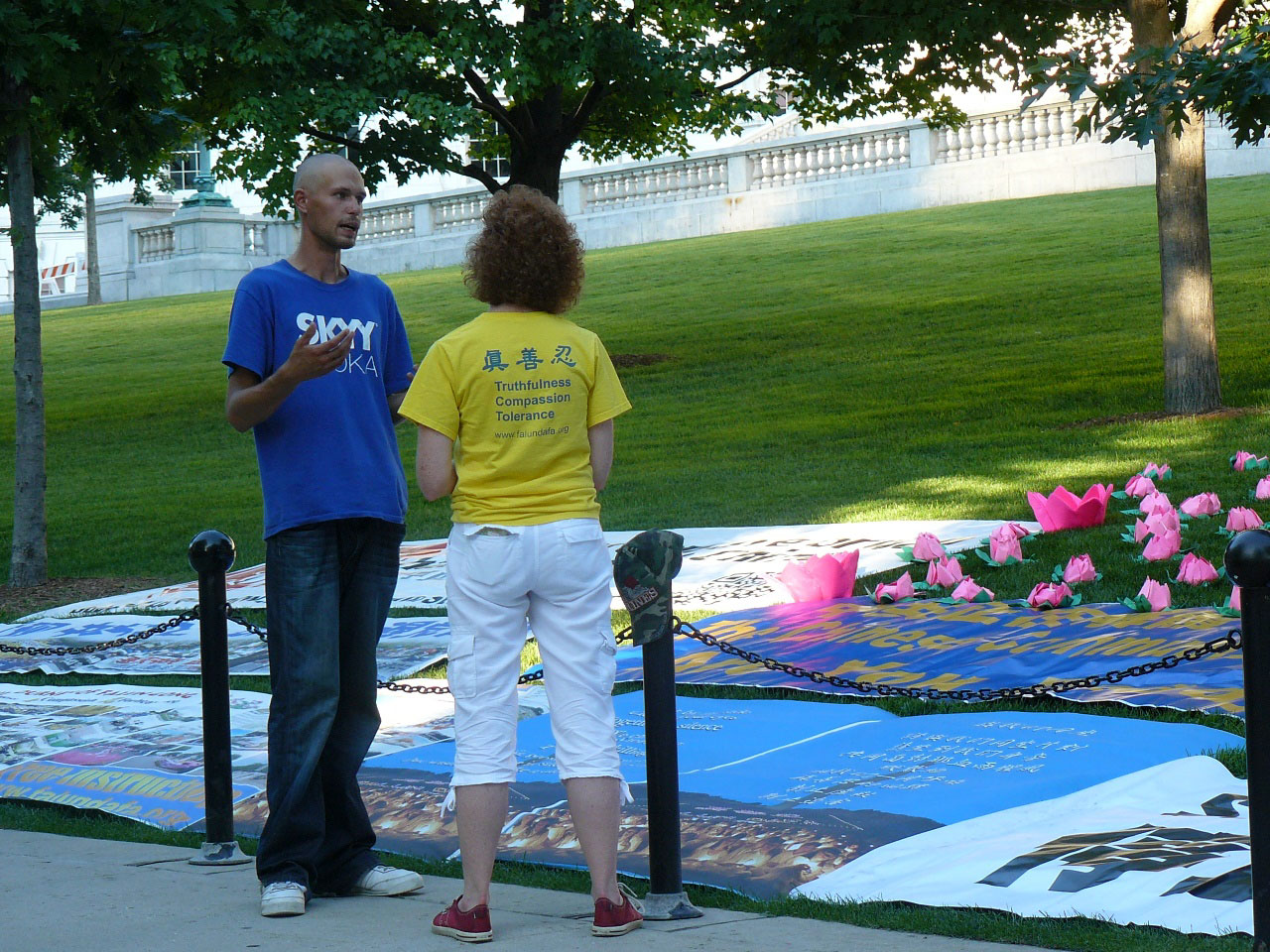 在活动结束前,一名非裔青年来到横幅前了解更多关于法轮功的信息。他表示自己也曾打坐,并想学习更多东方文化。学员告诉他,法轮功的主要著作《转法轮》解释了许多佛家、道家中人们解释不清的道理,其中包含着非常深层的智慧,如果他能读完《转法轮》,他就能比许多当代的中国人更了解中国的古老文化。听完学员的介绍后,这名青年表示自己一定要回家好好读读《转法轮》,并且上网去学习炼功动作。