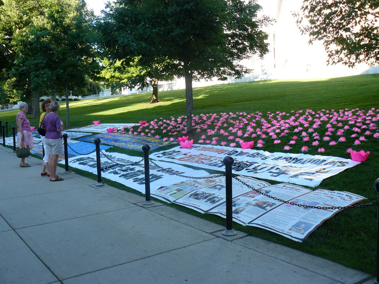 美丽的纸莲花和点点烛光吸引了不少路人驻足观看,有的人仔细阅读横幅上关于迫害的内容,也有的向学员了解更多法轮功的功法功理以及其“真、善、忍”的信仰准则,还有人表示将会在未来学炼法轮大法。