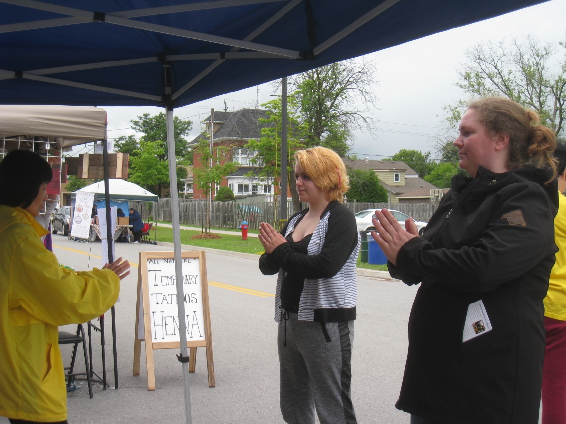 Jennifer Babin女士来自于斯图夫维尔市,今天跟女儿一块来参加草莓节活动,当经过法轮大法展位时被法轮功学员的功法演示所吸引,当场跟法轮功学员学炼起功法。学炼完后她说:“这个功法充满能量,我感到非常轻松。”