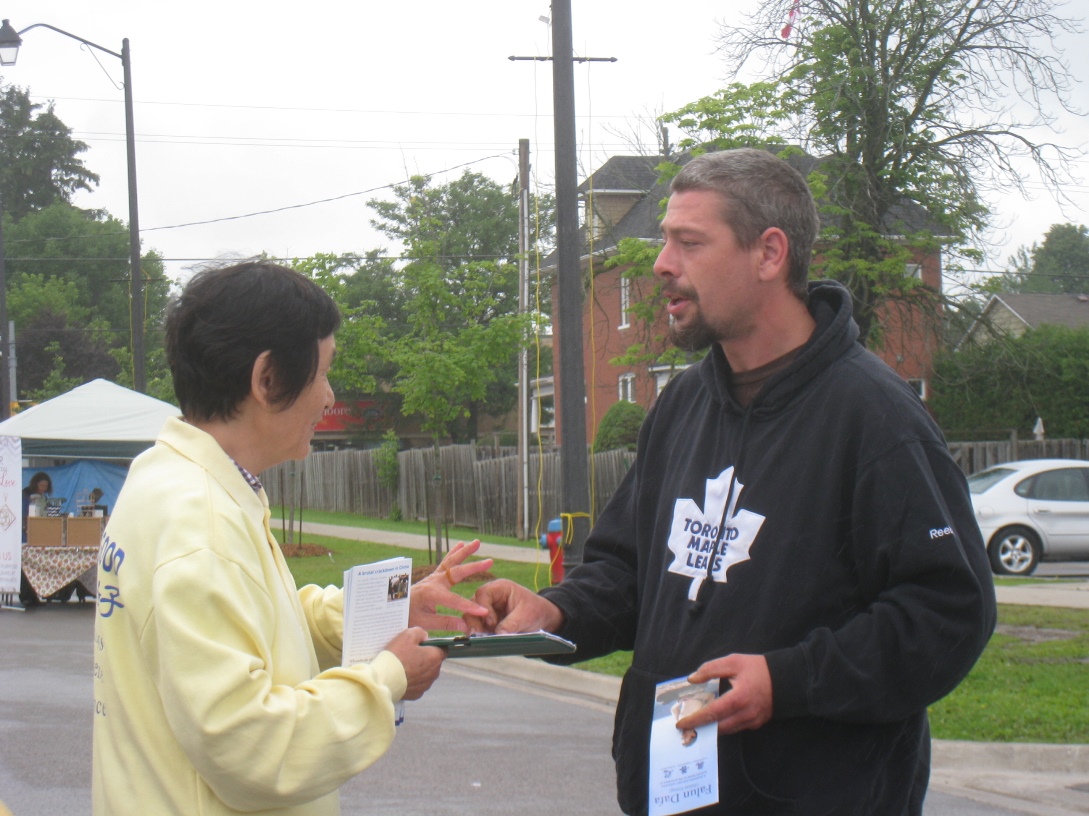 来自于斯图夫维尔市的Mark Sutherland先生在法轮大法展位说,他是第一次看到法轮功的,有时间时很愿意尝试学炼。Mark Sutherland先生说:“法轮功学员在中国正在遭受的迫害听起来很可怕。人们有自由去锻炼身体,炼这个功法就被抓进监狱、被拷打甚至被活摘器官……”Mark Sutherland先生说不下去了,他接着说:“我觉得我签名是对的,希望我的签名能够帮到你们!”