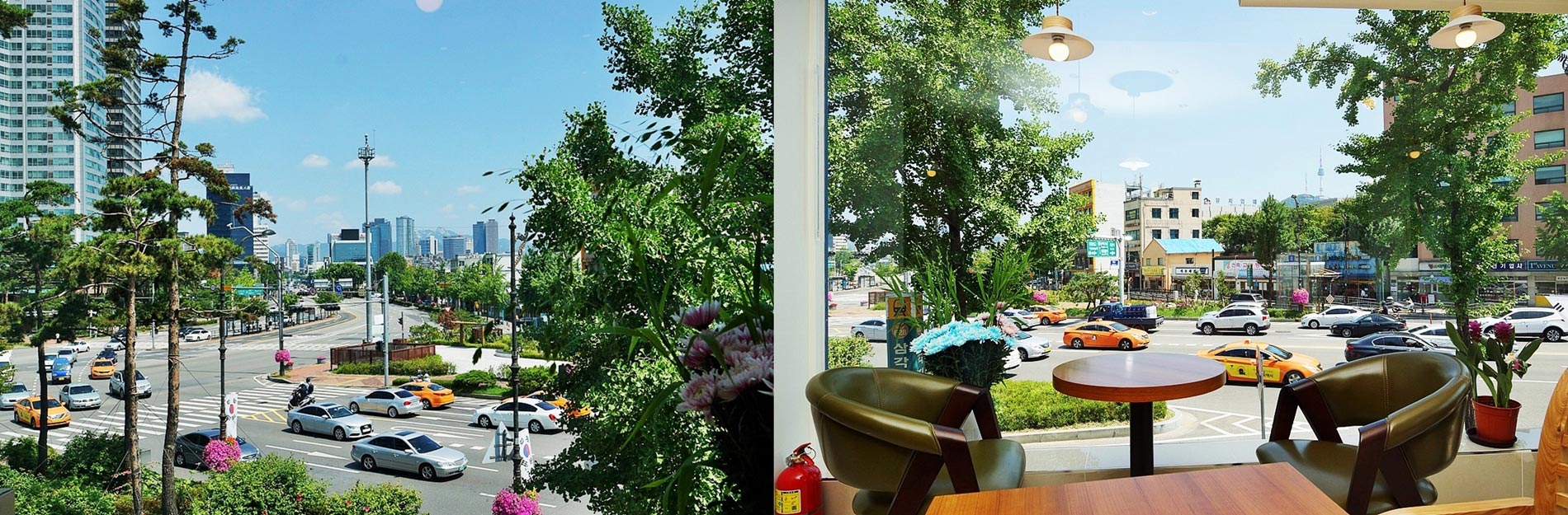 从一楼至三楼三面均由玻璃构成,在任何一个角度都可以看到首尔地标——南山首尔塔。天气晴朗的日子,还可远眺到首尔地标北汉山。建筑虽然只有三层楼,但因周边有美八军和国防部等主要设施等,建筑高度一直受到限制,虽然地处首尔市中心,周边并没有高层建筑。因此坐在三层楼,就可享受如同坐在二十层楼以上高层建筑的感受,景观视野极佳。此外,因周边设有小公园,植有松树和各种花草树木,又可感受到乡村度假村般的宁静温馨的气氛。