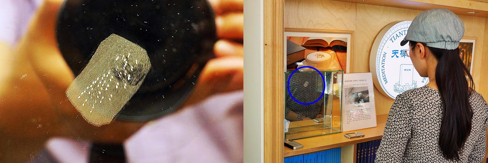 ![]() 图8: 在天梯书店施工装修之际,绽放的优昙婆罗花,为了便于光顾书店的任何人都能看到,装在玻璃箱内,摆放在书店1楼柜台旁的书架上。 |