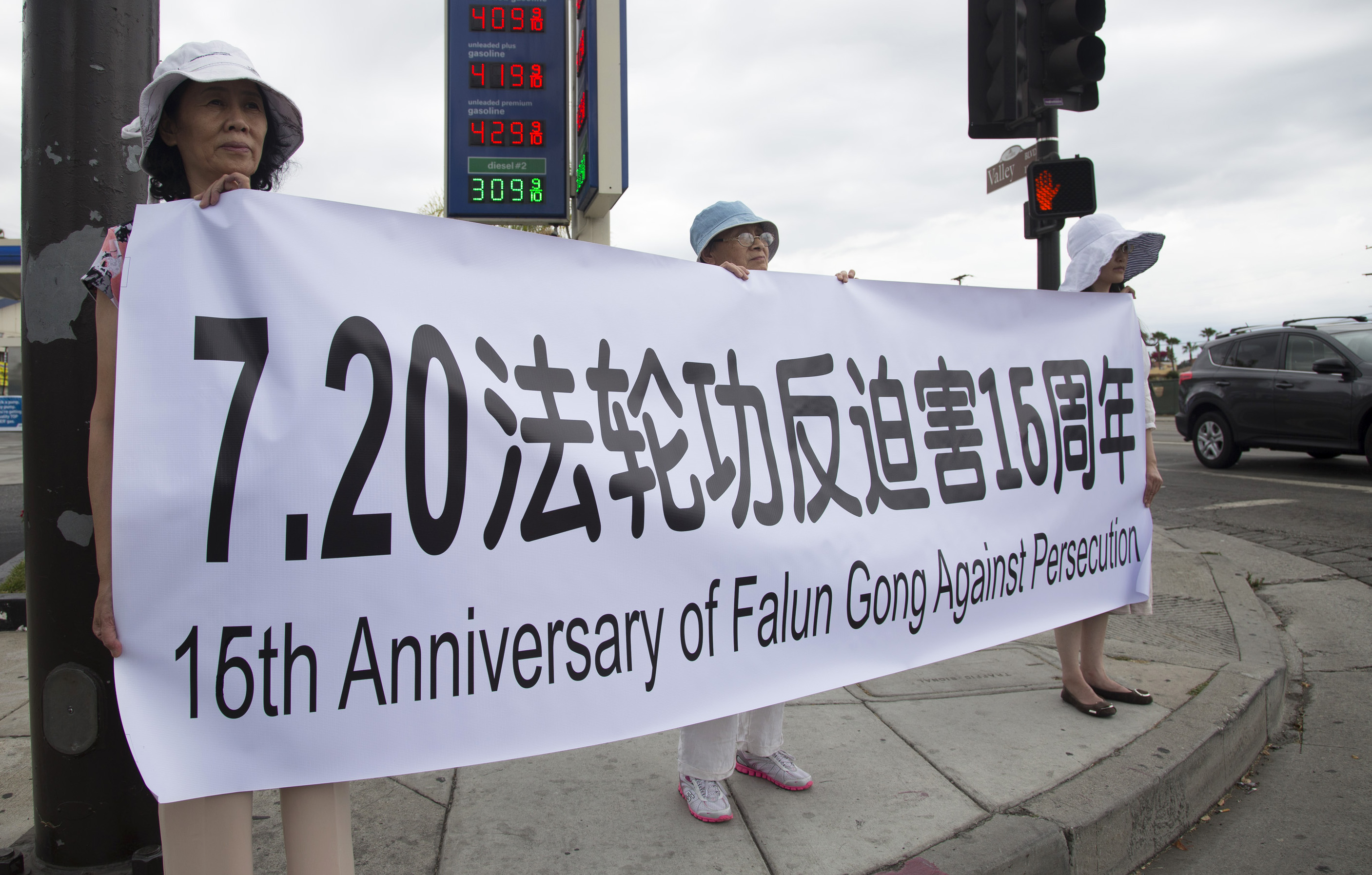 横幅写道“悼念被迫害致死的法轮功学员”、“7.20法轮功反迫害16周年”、“历史巨变在眼前 真相就是指路灯”、“天意尽显 中共将亡”、“退出党团队 平安福来到”、“法办迫害法轮功的元凶江泽民”等。