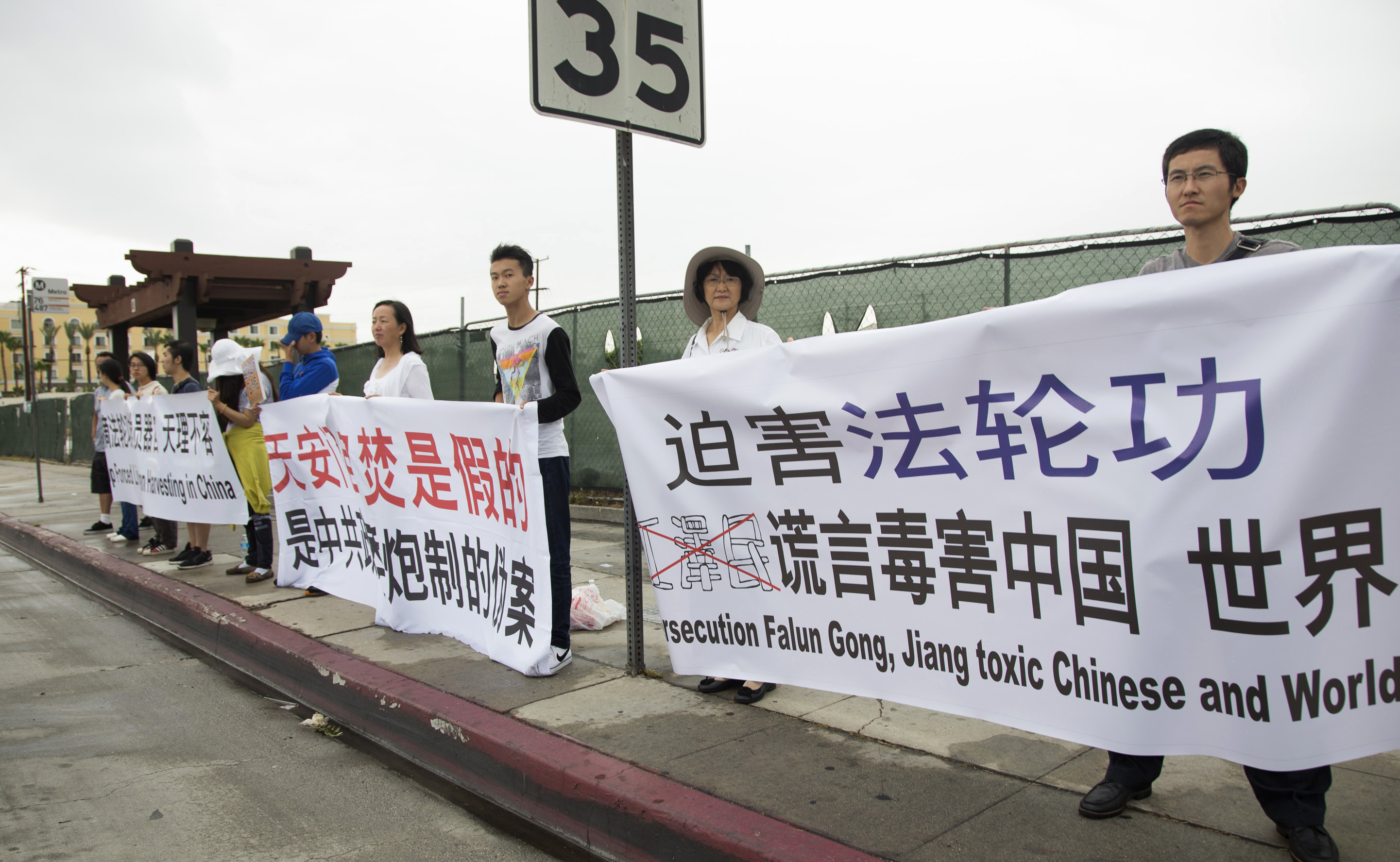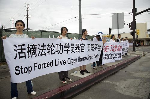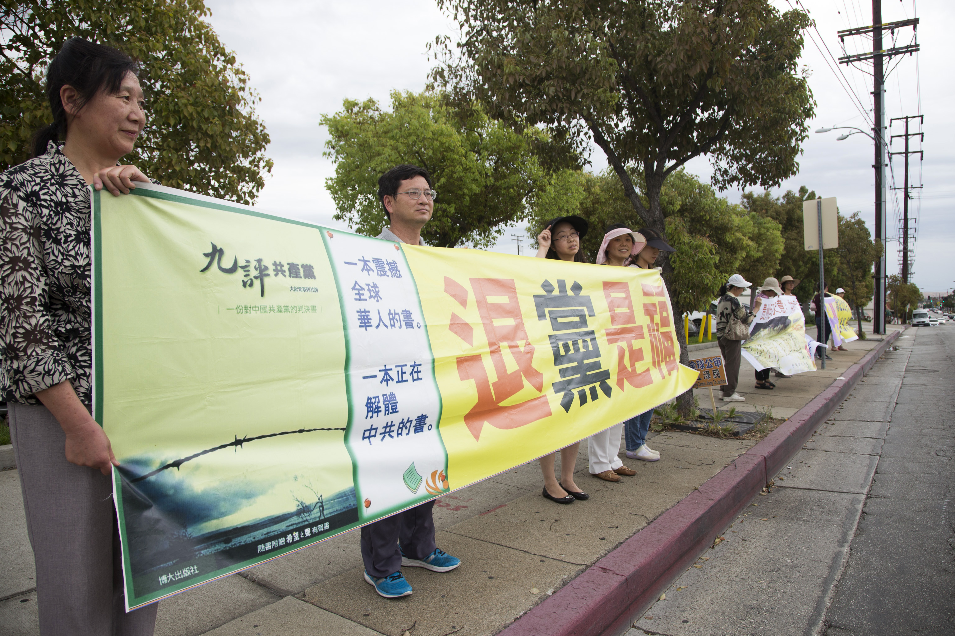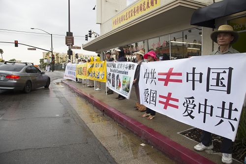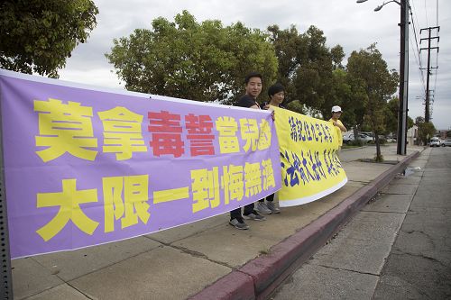 活动开始不久,下起了小雨,这是正在经历百年大旱的南加州半年来的第一场雨。学员们站立在雨中,继续拉着标语向民众传递着真相。他们用自己的亲身故事,告诉大家发生在中国十六年来的人权迫害,引起路人围观和关注。