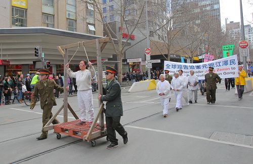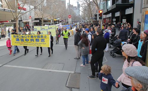【明慧网二零一五年七月二十日】(明慧记者墨尔本采访报道)二零一五年七月十八日,墨尔本法轮功学员在市中心举行了“纪念七二零迫害十六周年”大游行,呼吁制止中共对中国广大无辜善良民众的迫害,声援一个多月以来人数激增到八万的控诉迫害元凶江泽民的大陆法轮功学员和亲友,以及两亿多退出中共党、团、队组织的中国勇士,希望更多的世人尽快觉醒。