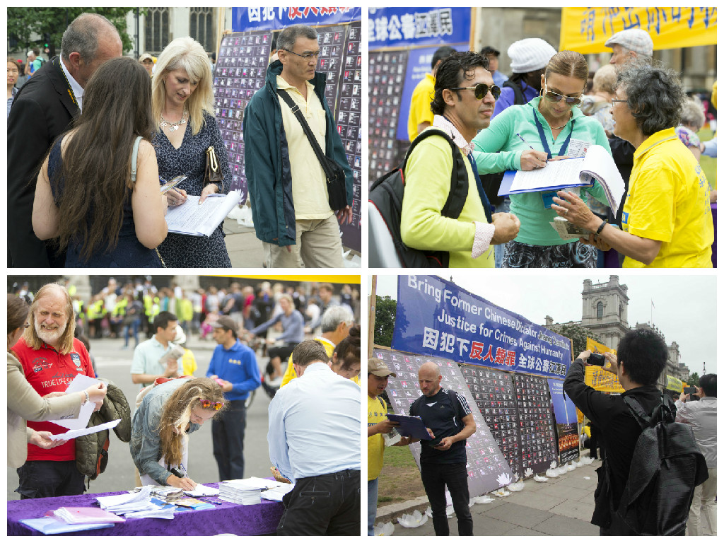 七月十八日是星期六,约百位法轮功学员在伦敦中使馆前集合,并从那里开始步行,经过热闹的伦敦市中心、中国城、最后来到首相府唐宁街氏号外,游行中有些法轮功学员们手捧着被迫害致死的法轮功学员的遗像,打着“声援三:退.超二亿,迎接中华新纪元”等横幅、沿途吸引了很多行人的关注。下午三时,向英国首相府递交了一份给首相卡梅伦的请愿书,连同写满英国社会民众签名的请愿表。