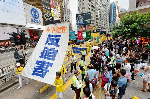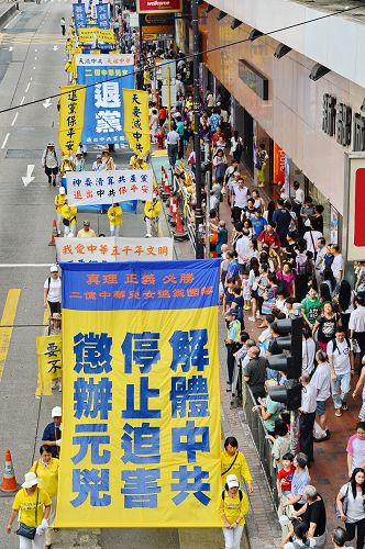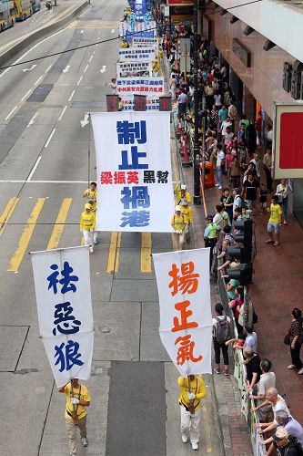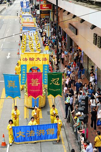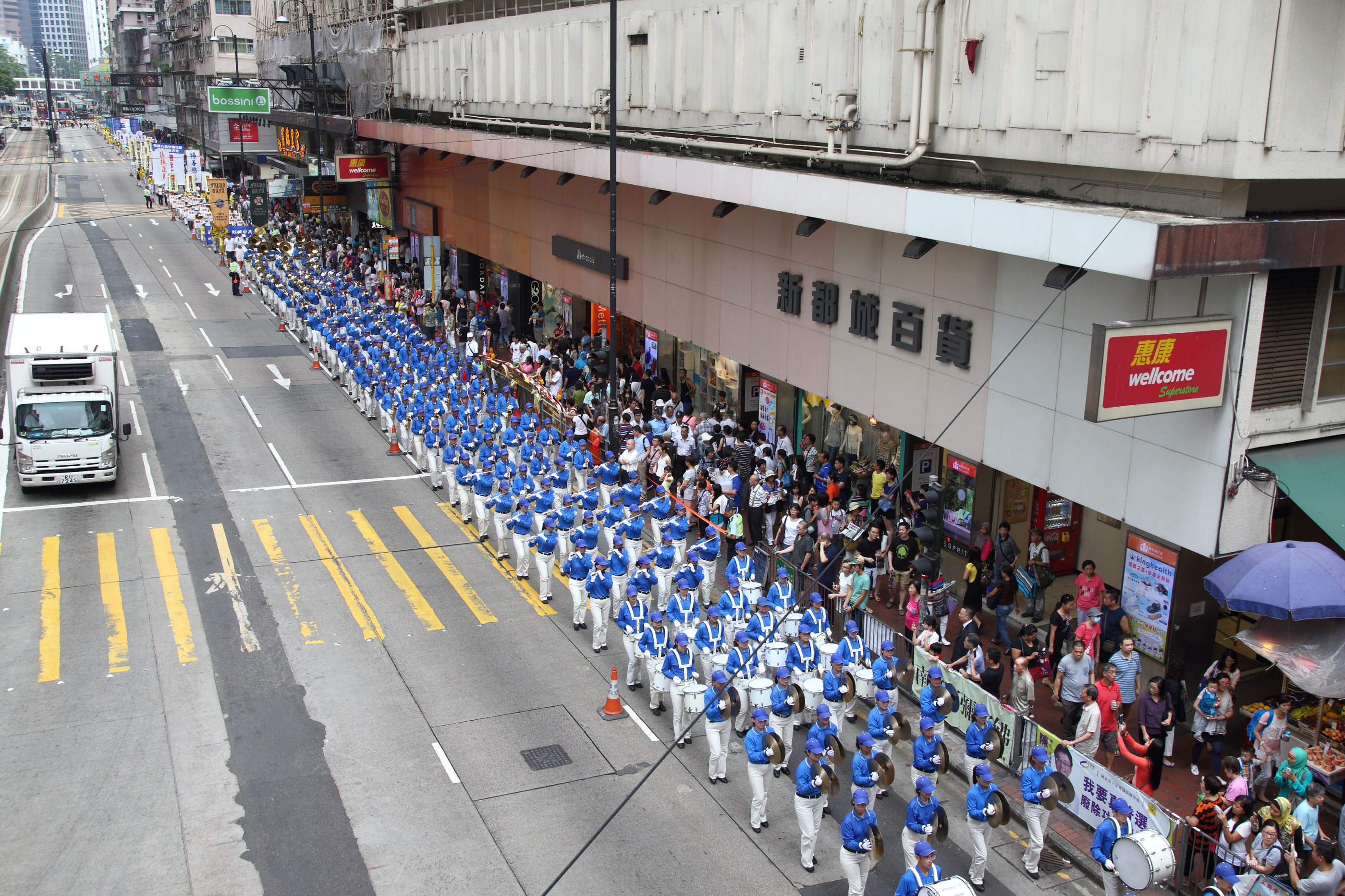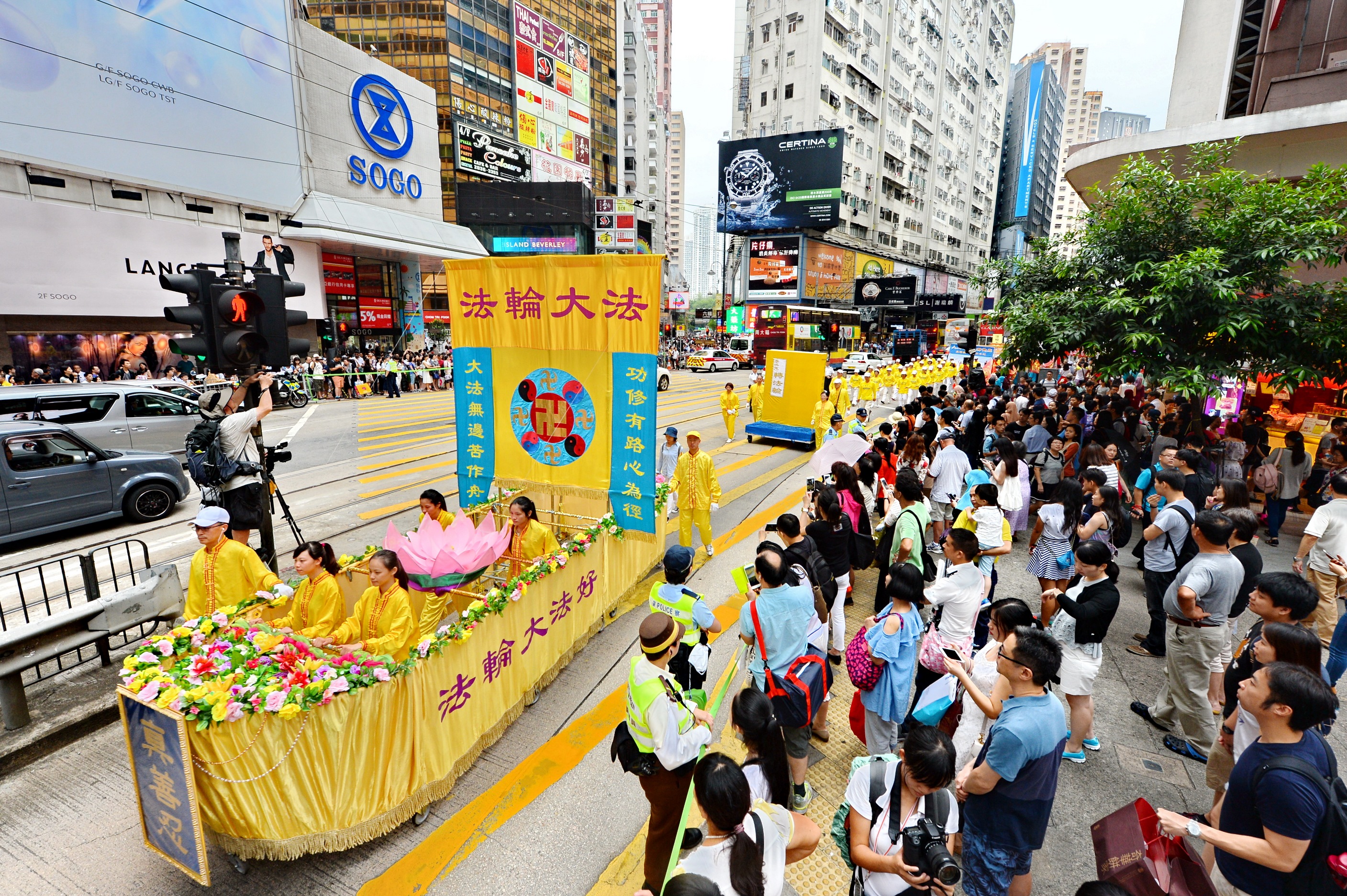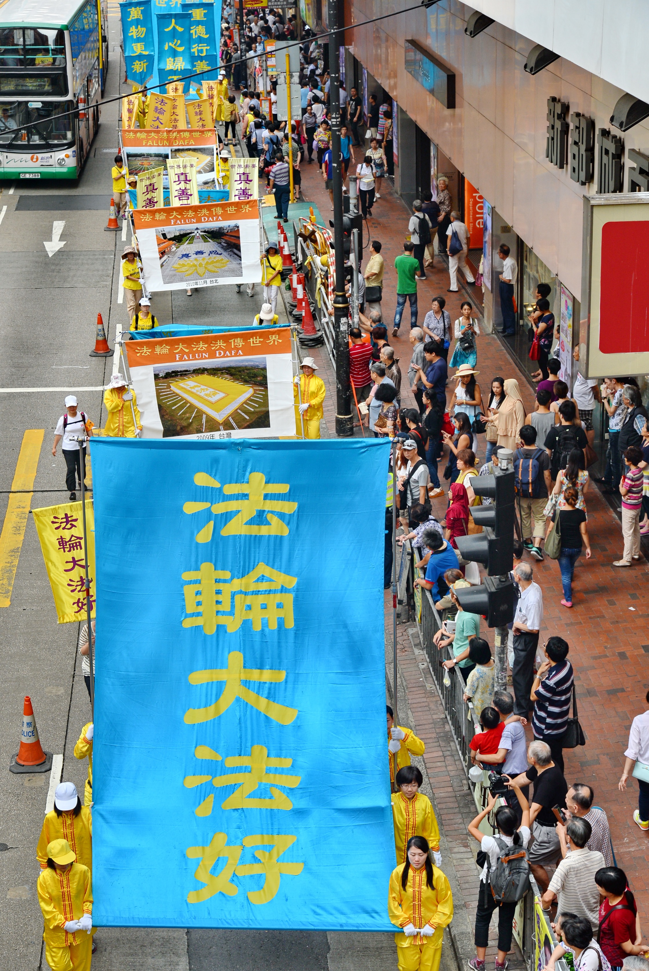 法轮功学员的游行队伍于下午二点半在天国乐团的引领下,从北角英皇道遊乐场出发,沿港岛区英皇道、轩尼诗道,途经闹市铜锣湾、湾仔、中环,最终到西环中联办,历时约四小时,沿途吸引行人、游客纷纷驻足观看。旗阵鲜明的真相,震撼许多民众,特别是大陆游客纷纷拿相机、手机或小型录像机拍摄,将这难得的一幕带回去与亲友分享。