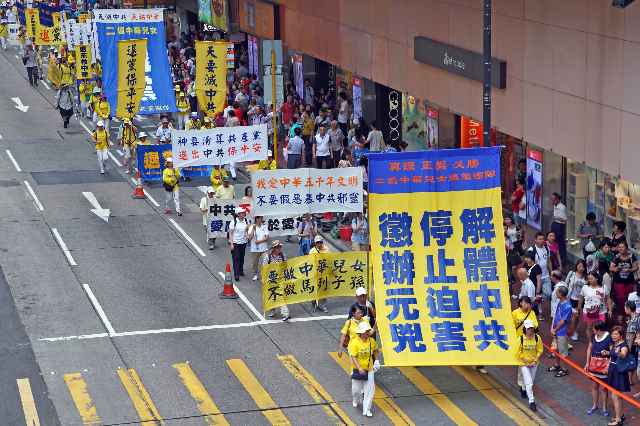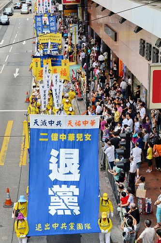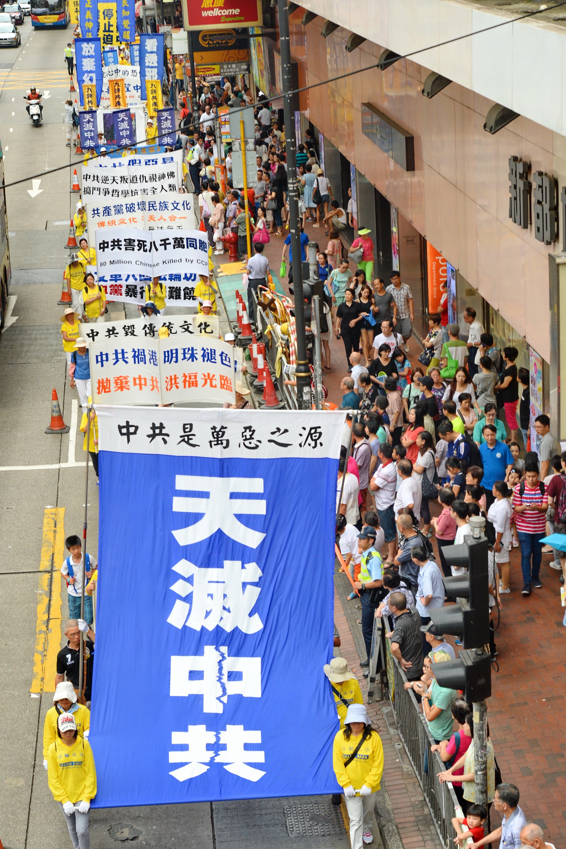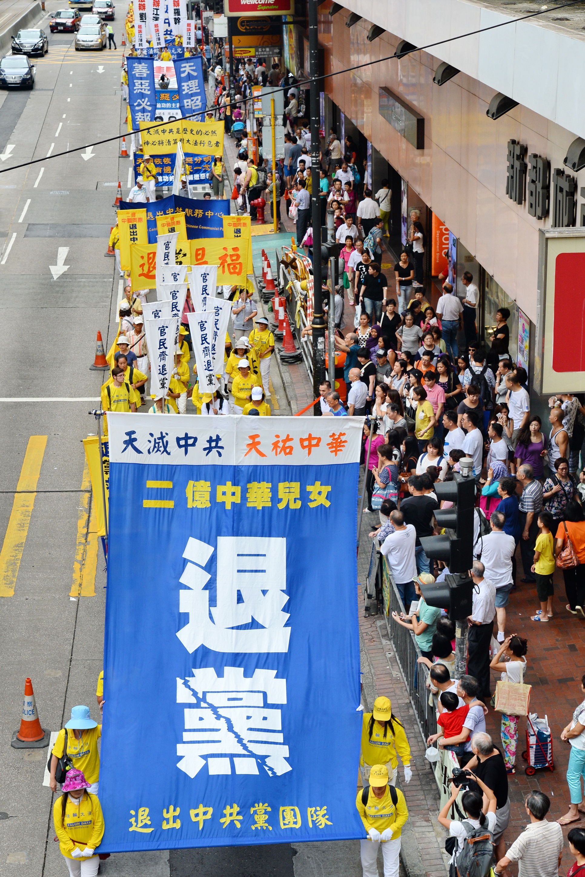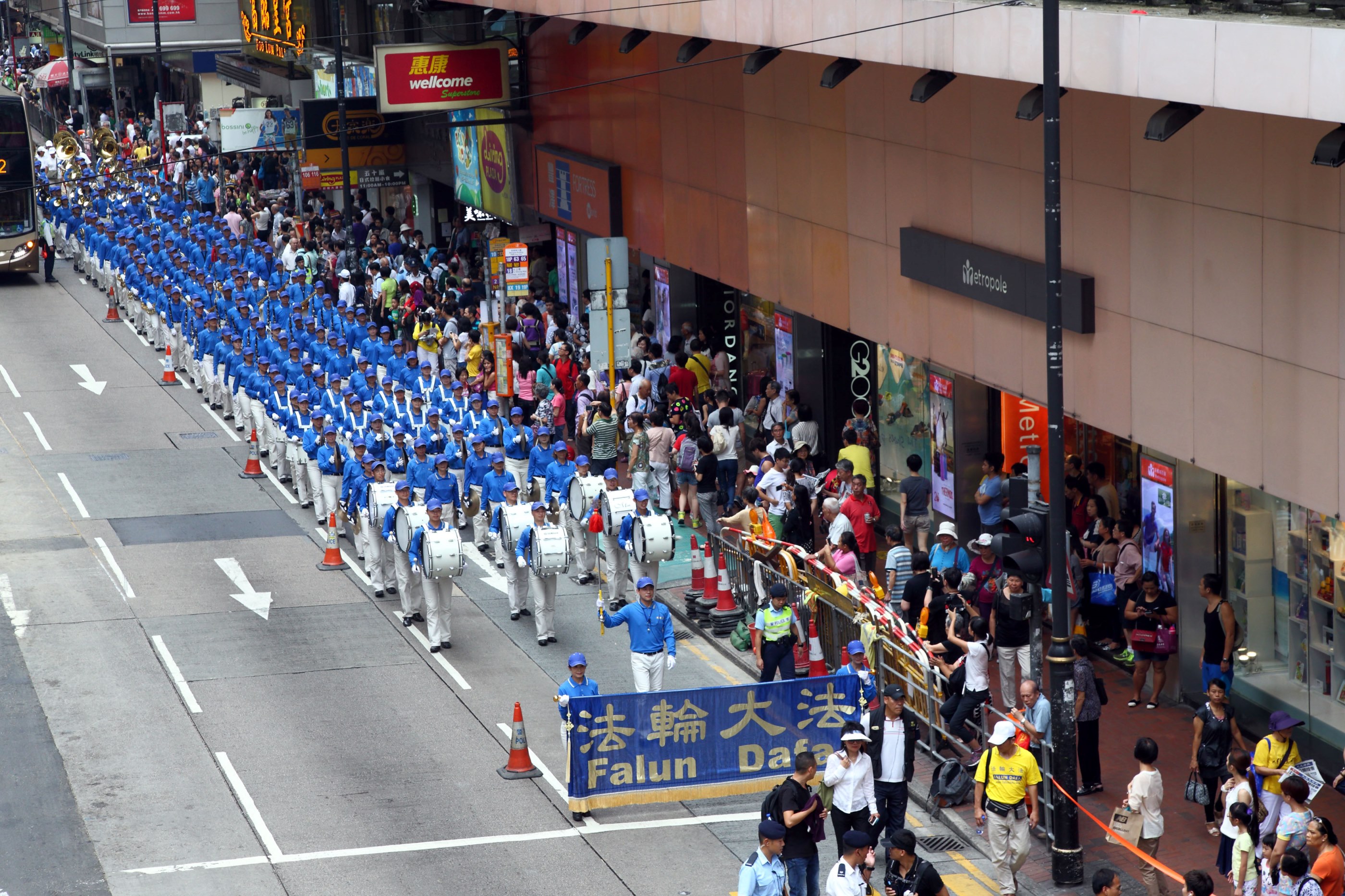 法轮功学员的游行队伍于下午二点半在天国乐团的引领下,从北角英皇道遊乐场出发,沿港岛区英皇道、轩尼诗道,途经闹市铜锣湾、湾仔、中环,最终到西环中联办,历时约四小时,沿途吸引行人、游客纷纷驻足观看。旗阵鲜明的真相,震撼许多民众,特别是大陆游客纷纷拿相机、手机或小型录像机拍摄,将这难得的一幕带回去与亲友分享。