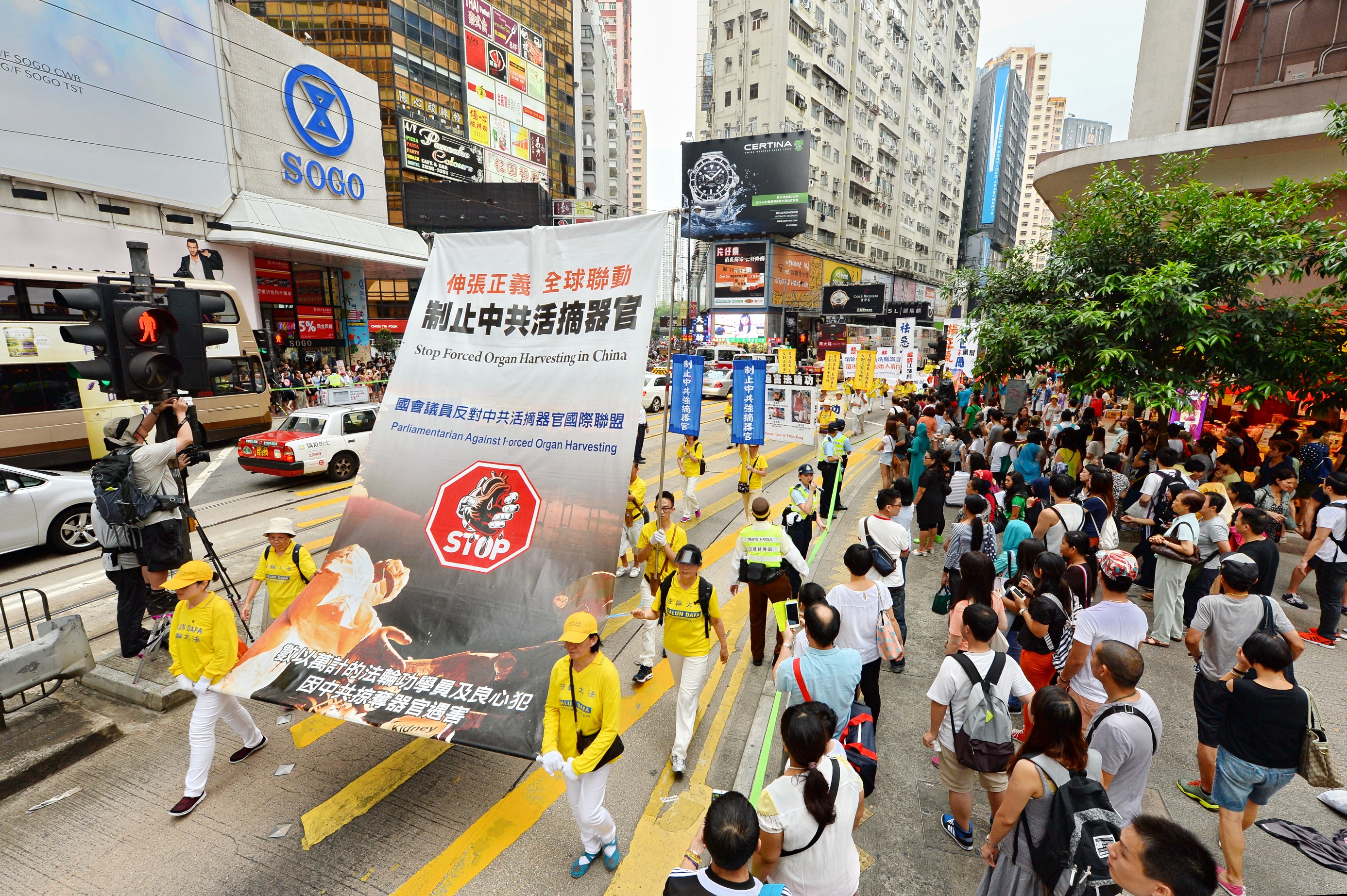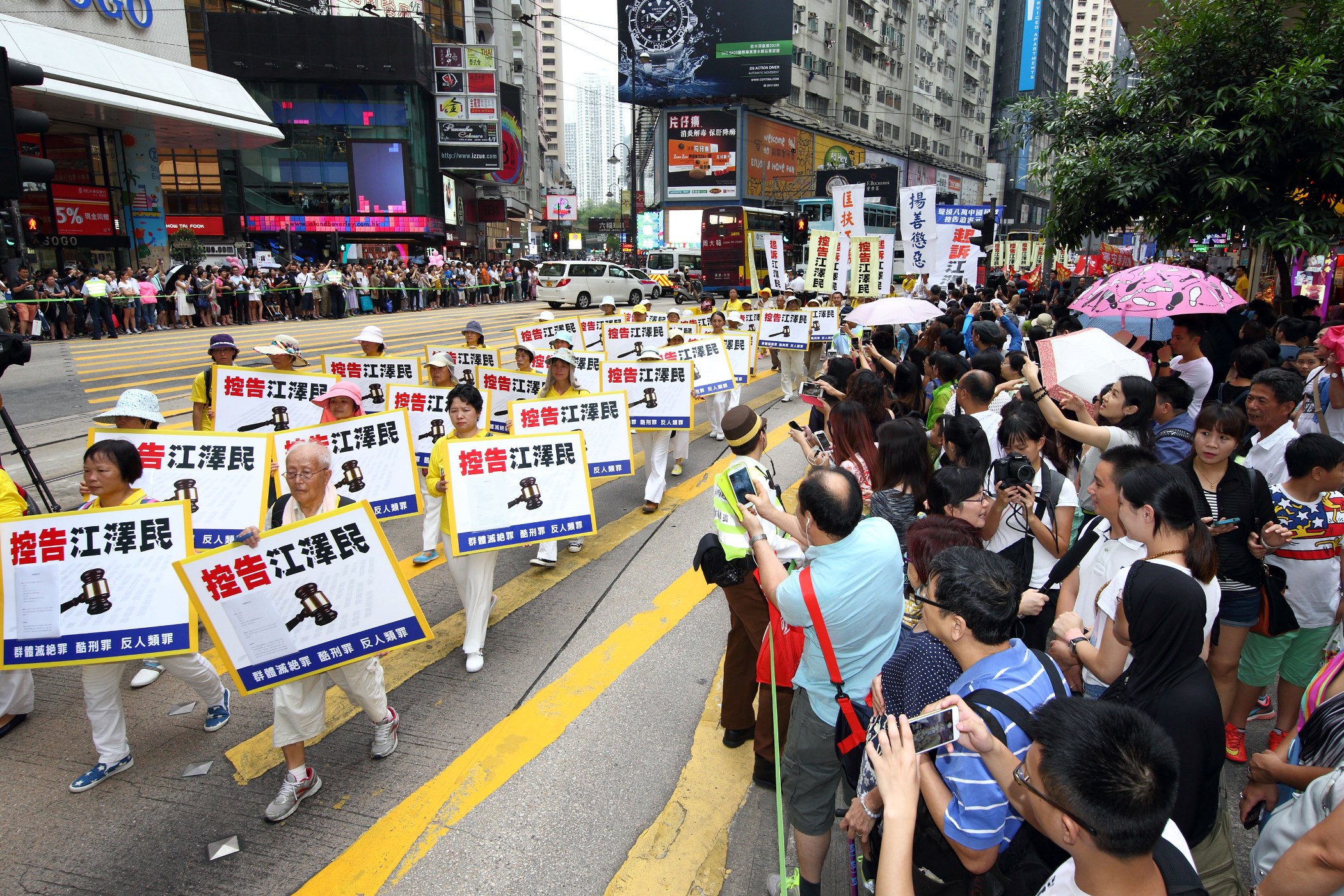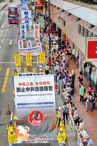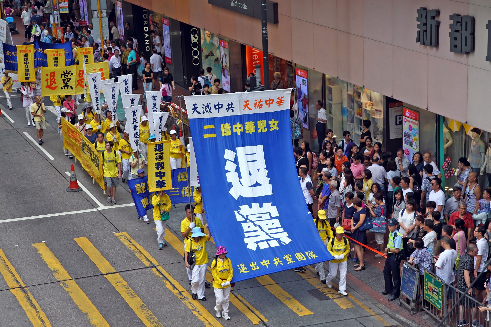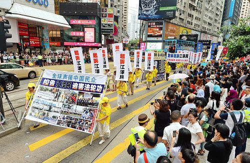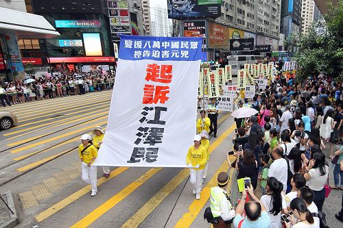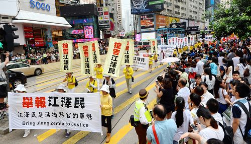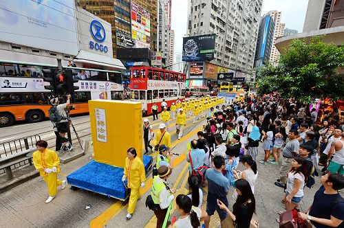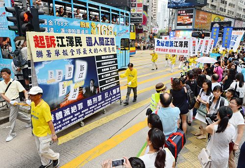 法轮功学员的游行队伍于下午二点半在天国乐团的引领下,从北角英皇道遊乐场出发,沿港岛区英皇道、轩尼诗道,途经闹市铜锣湾、湾仔、中环,最终到西环中联办,历时约四小时,沿途吸引行人、游客纷纷驻足观看。旗阵鲜明的真相,震撼许多民众,特别是大陆游客纷纷拿相机、手机或小型录像机拍摄,将这难得的一幕带回去与亲友分享。