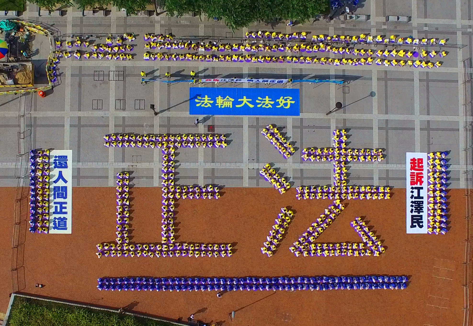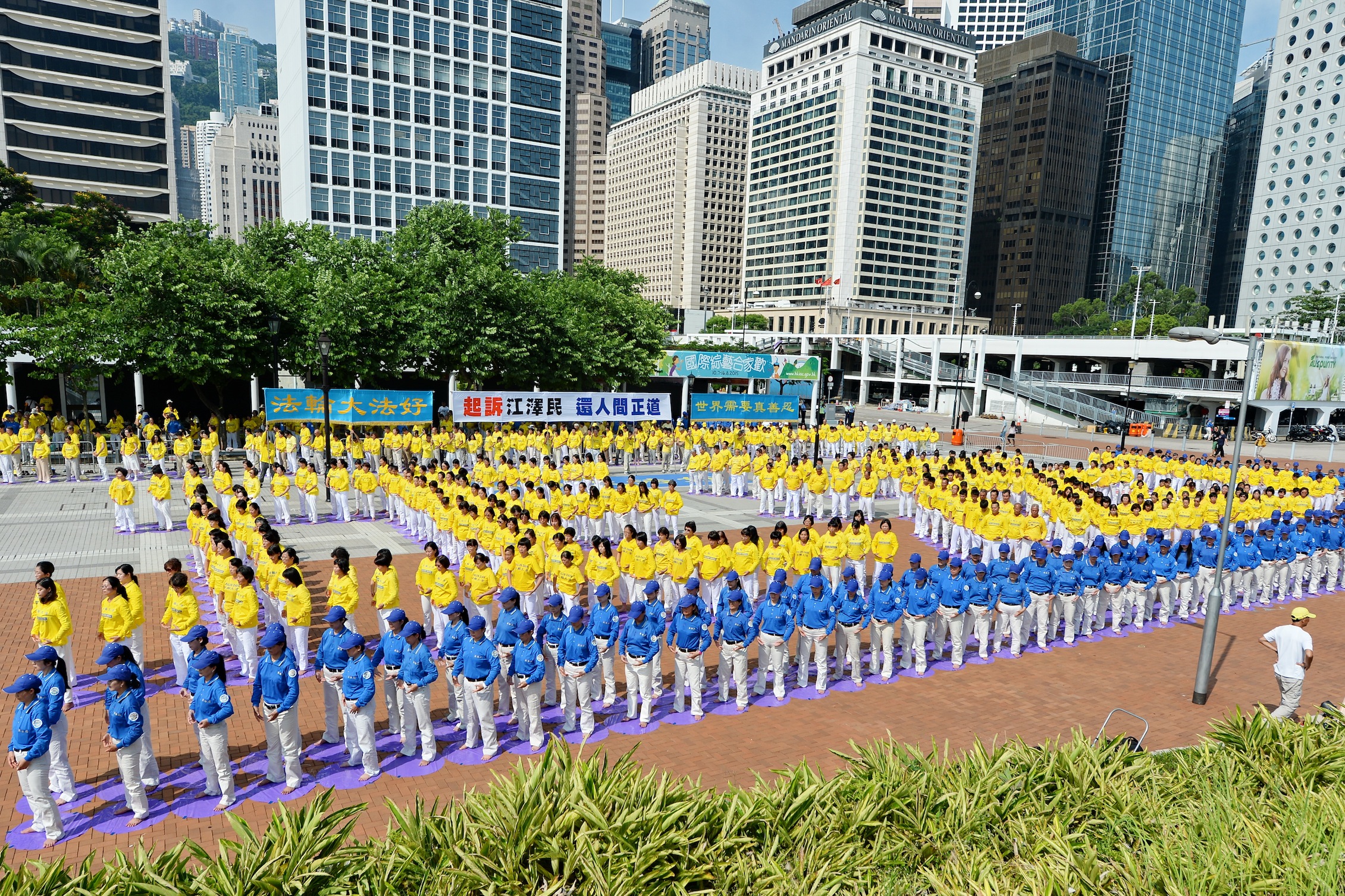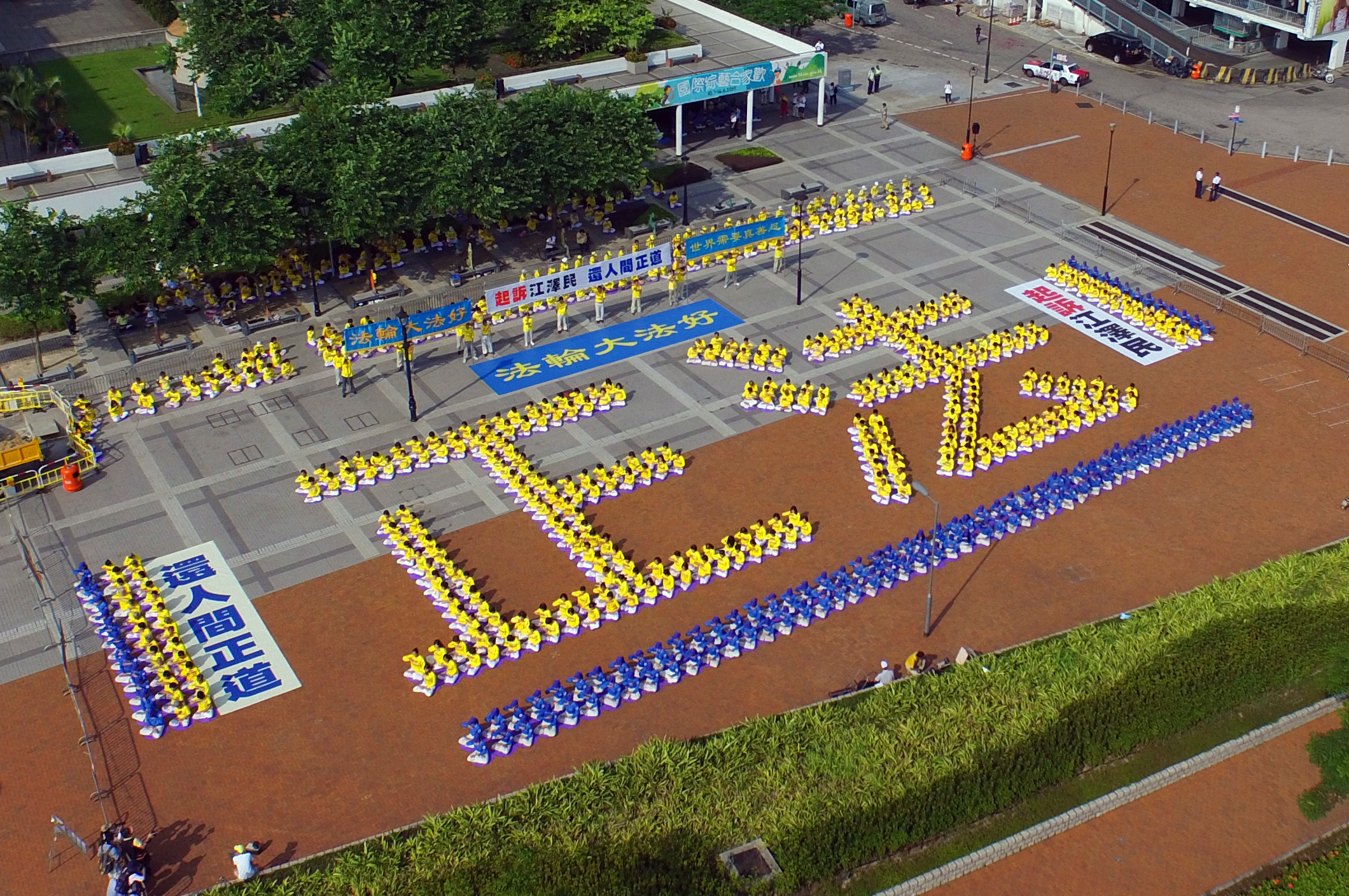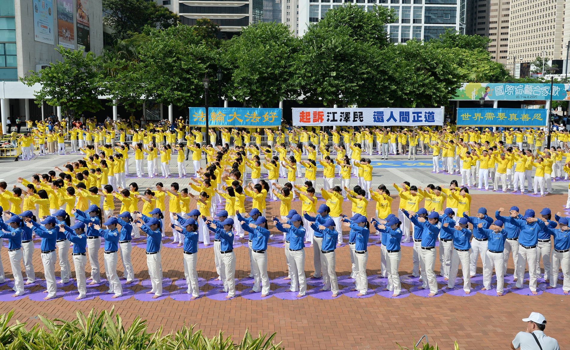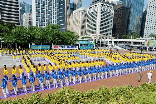 ![]() 图1-4:二零一五年七月十九日上午,法轮功学员在香港中环爱丁堡广场排字与炼功。 |