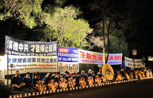 参加当晚静坐悼念的中西大法弟子中,有两岁的孩童,也有八十多岁的长者。在一年中最寒冷的冬夜,学员们点起烛光、拉起横幅,悼念从一九九九年七月二十日迫害开始至今、十六年中,因坚持对“真、善、忍”的信仰,而被中共残酷迫害致死的数百万中国大陆法轮功学员。点点烛光传播着慈悲与善良,醒目的横幅、花圈,呼吁澳洲社会关注,一同拯救善良、结束迫害。