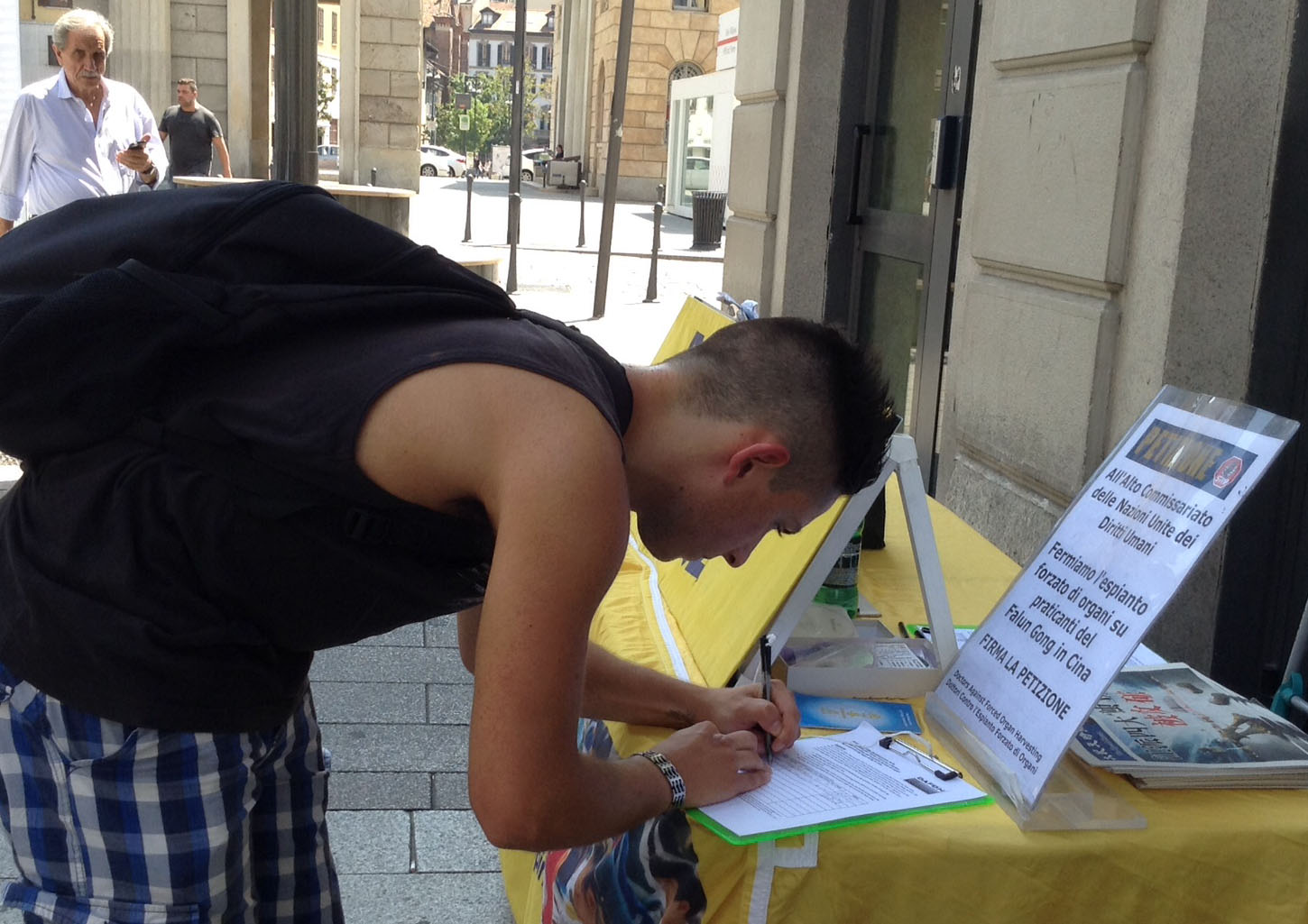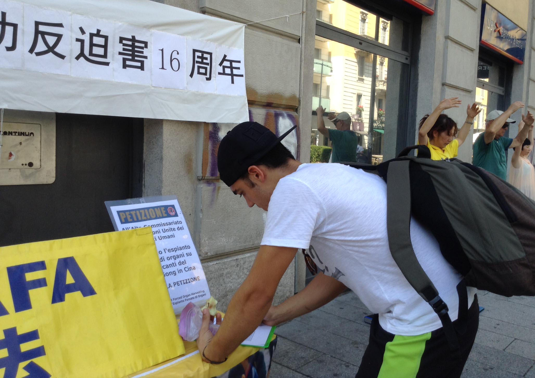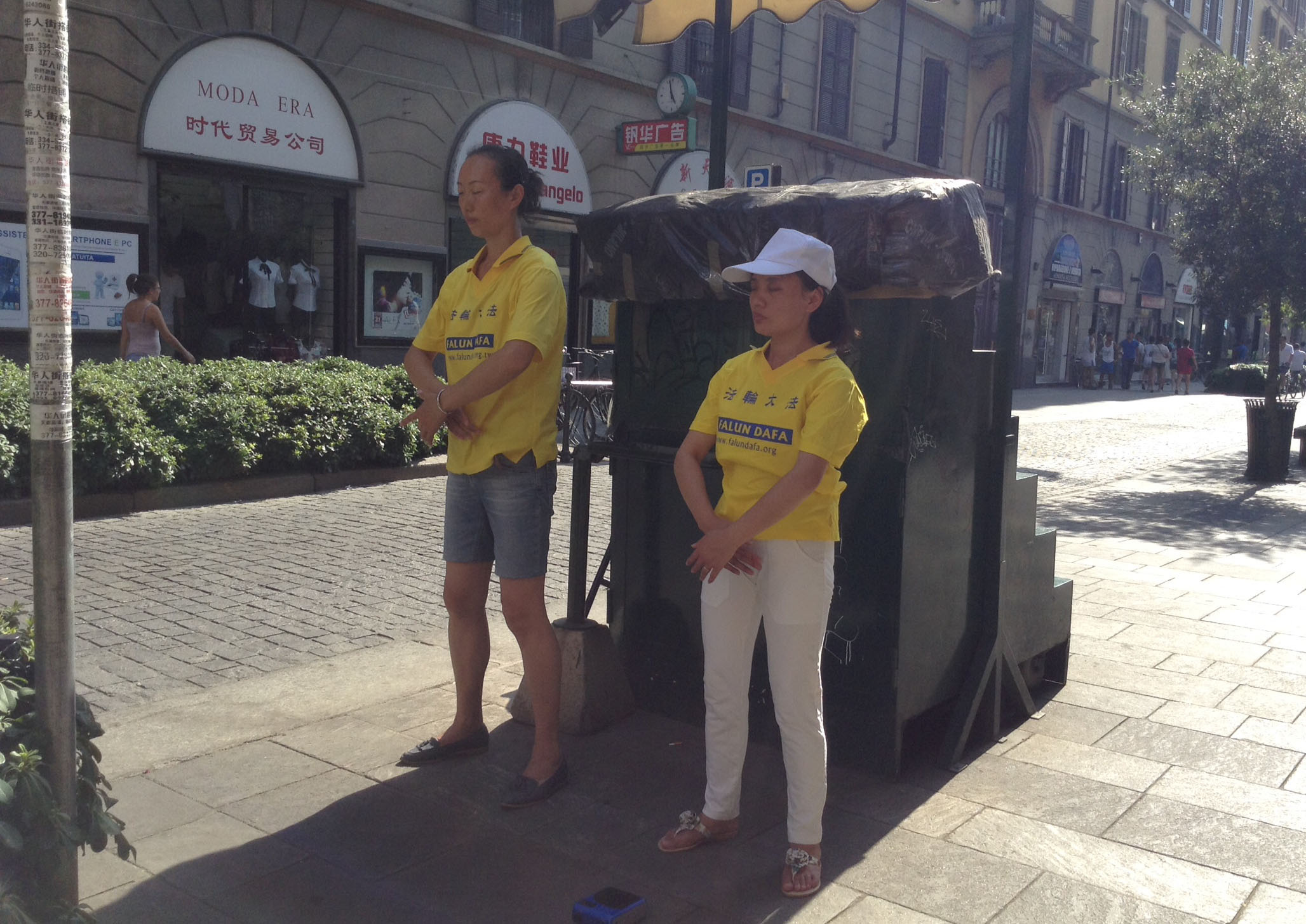 【明慧网二零一五年七月二十二日】二零一五年七月十八日至二十日连续三天,意大利法轮功学员分别在米兰市中心,华人街和中领馆前举办活动,向意大利民众、海内外华人和各国游客讲真相,声援两亿中国勇士退出中共,以及声援目前正在掀起的、强劲的中国大陆民众控告迫害元凶江泽民的正义大潮。