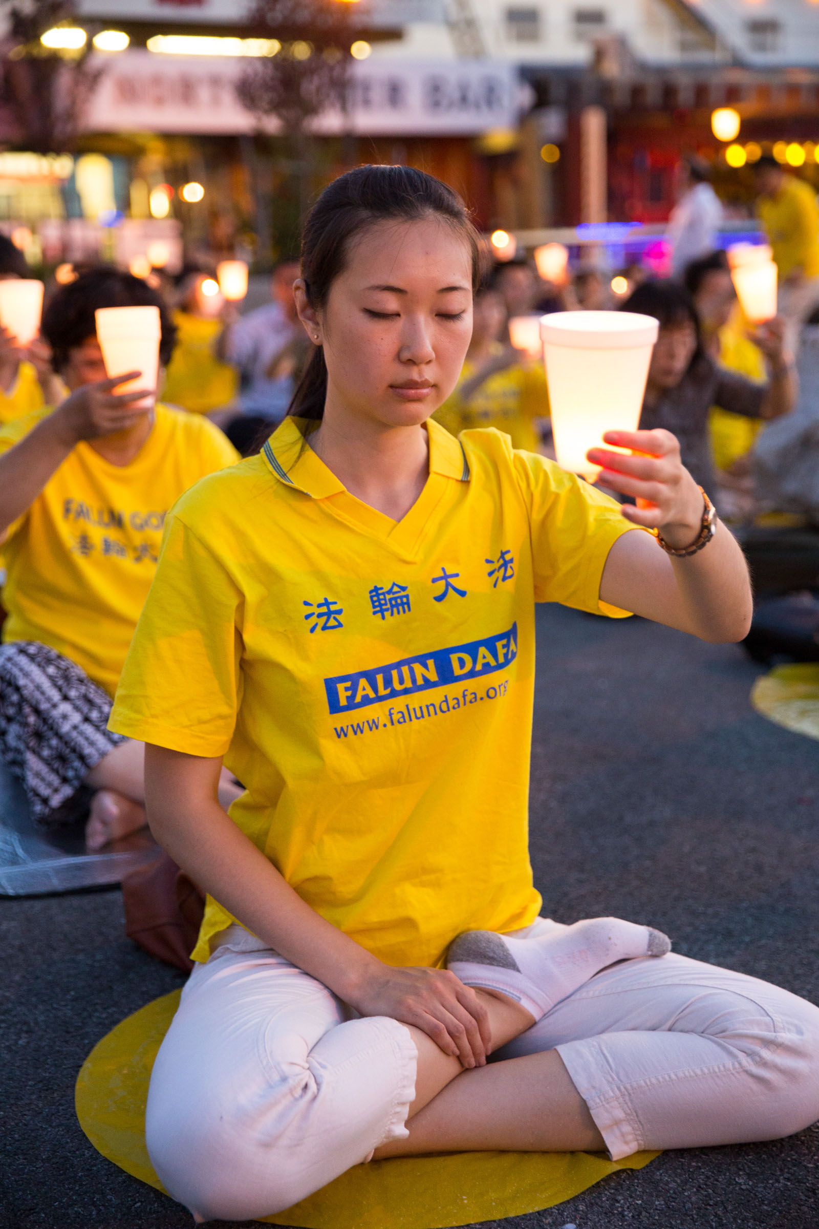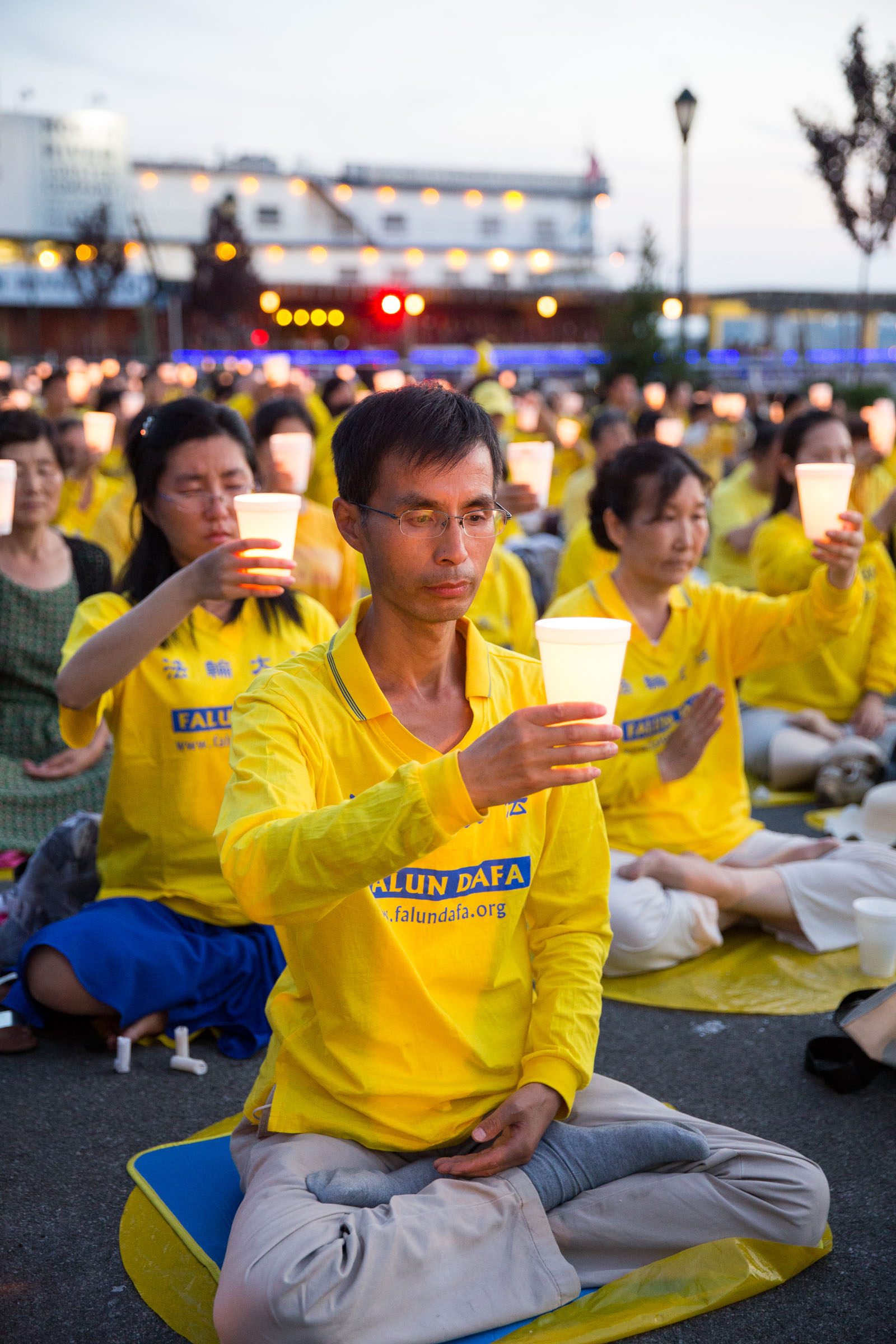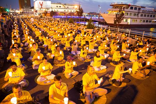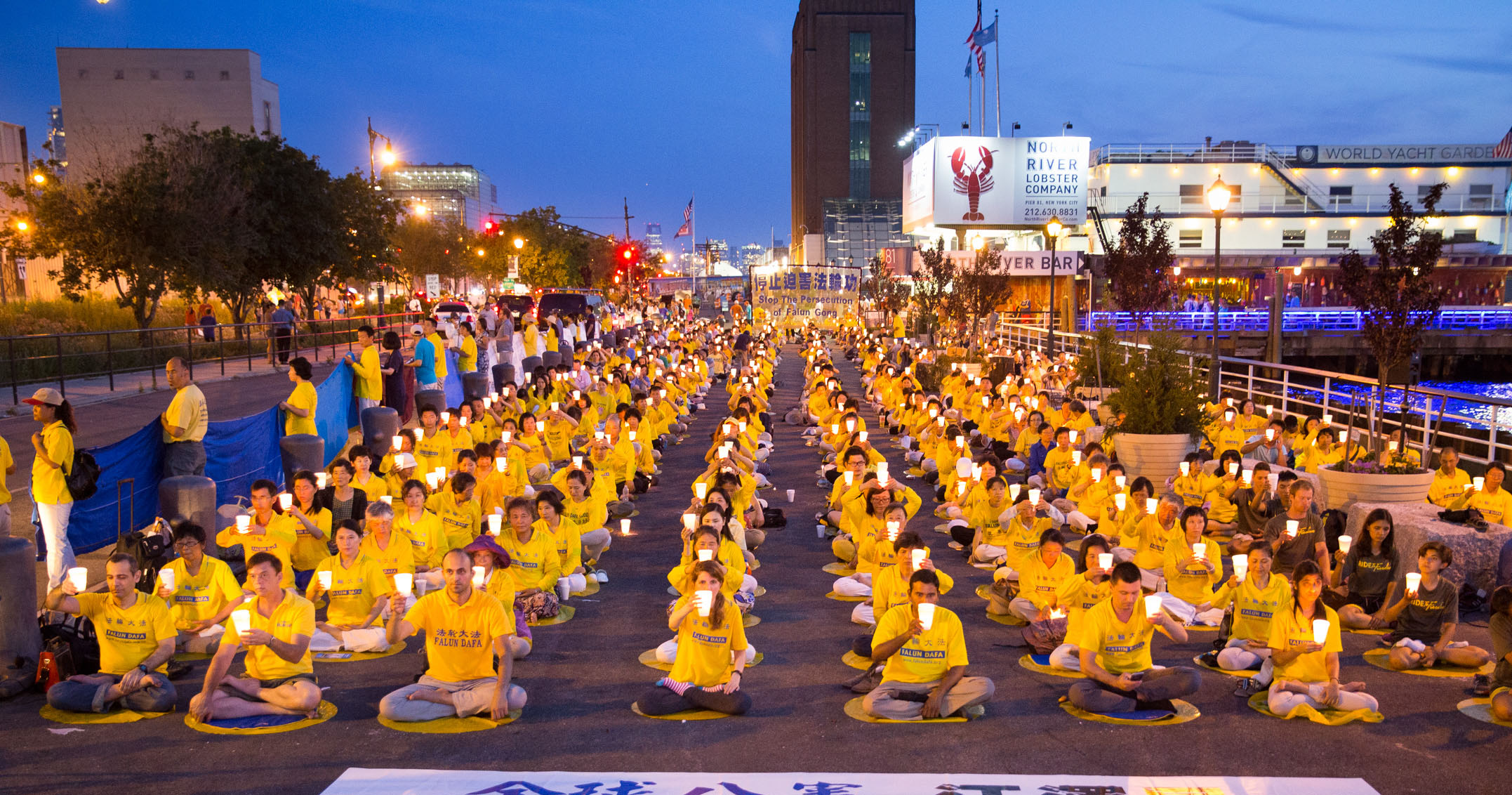 当天傍晚,法轮功学员纽约中领馆对面打出“停止迫害法轮功”、“全球起诉江泽民”、“法轮大法好”的横幅。数百名法轮功学员沿着河岸排列整齐,延绵上百米。他们先是演示法轮功的功法;随后在夜幕低垂时,学员们燃起点点烛光,默默悼念数百万在中共残酷的迫害中被夺去生命的同修。在学员静坐的最前面,一副写着:“停止迫害法轮功”的英文横幅,上面围绕了一圈、盛着点点烛光、象征法轮功学员圣洁、坚韧之精神的橘红色莲花座,场面肃穆而慈悲感人。